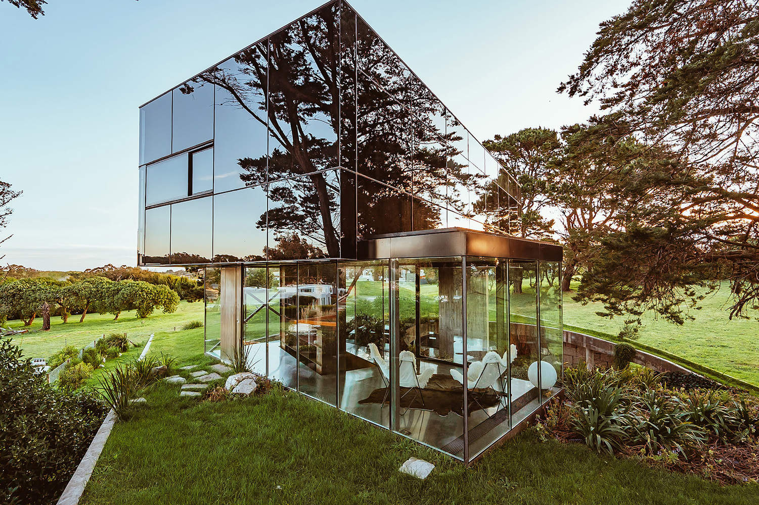随后,为完善整体布局并使其在空旷空间中仿佛悬浮一般,我们放置了一个具有反射效果的盒子状结构,这一形式能够与自然环境相互呼应并产生多重视觉效果。