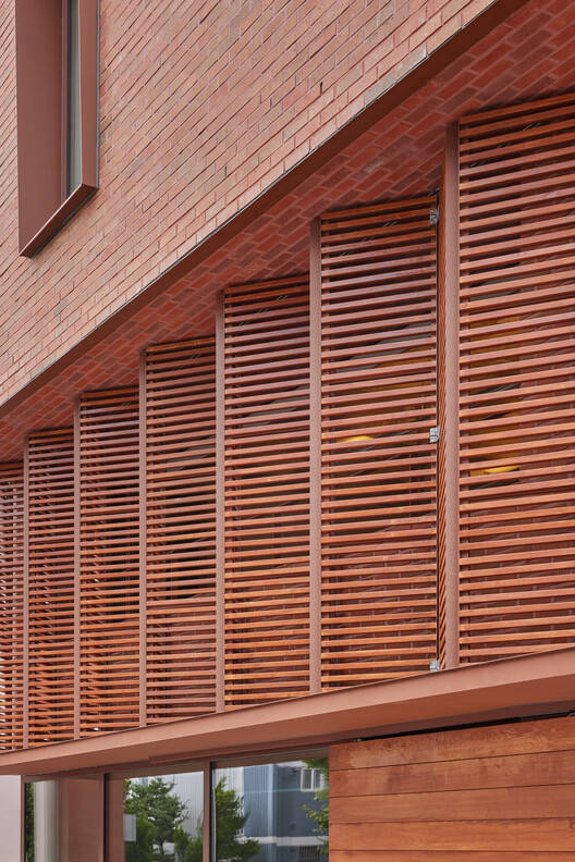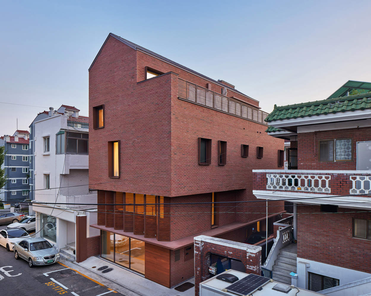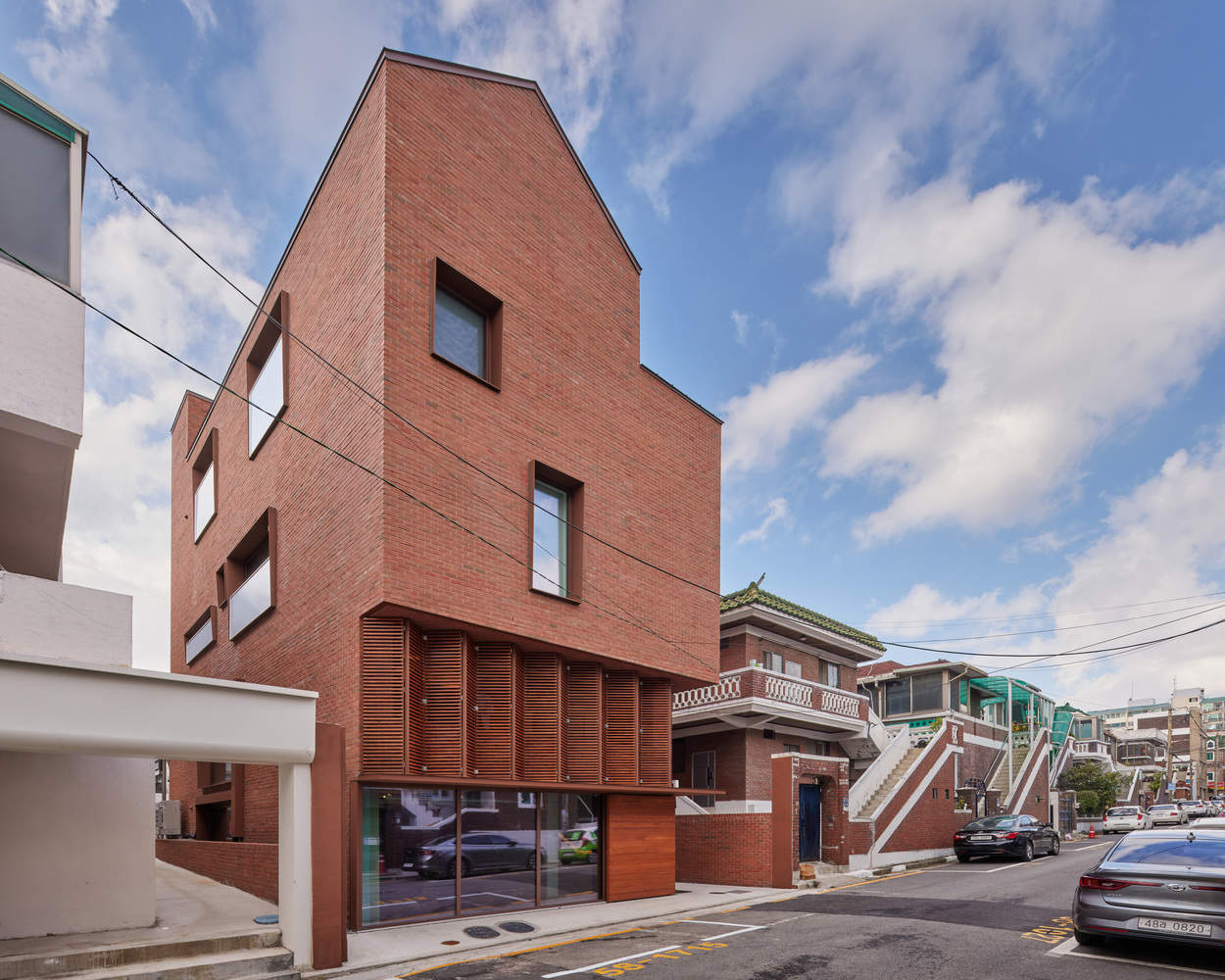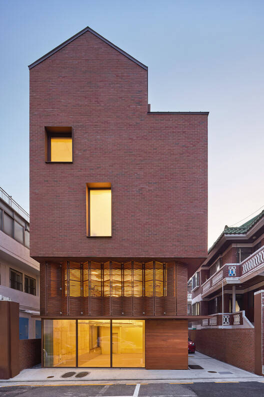 From the architect. In the 1970s, as apartments gradually became dominant in South Korea, a more peaceful type of housing emerged: three story brick houses built by small contractors. These houses are made of red bricks and white railings, which still shape the style of many low rise residential areas to this day. The Wonderful Uman project conforms to this background and chooses to integrate into the surrounding environment rather than rewriting it. The color tone of its red brick exterior walls is slightly lighter than that of neighboring buildings, which not only highlights its own existence but also maintains harmony and unity with the street view.