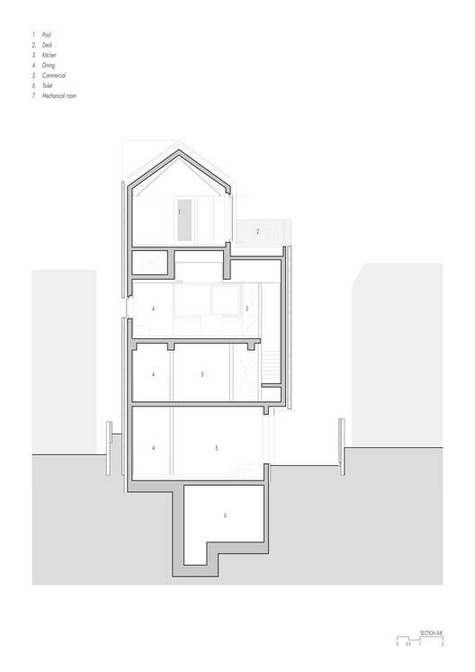 功能与空间的创新融合:项目在有限的155平方米基地上实现了多功能、高效率的空间利用。将商业与住宅相结合,打破了传统的功能分区,体现了对城市有机生长的理解。商业单元的独立入口和可折叠门设计,使得建筑能够灵活适应不同的商业需求。而顶层的私人室内泳池,更是将私密性与奢华感完美结合。泳池的混凝土池体兼具结构和美学功能,展现了建筑师对空间利用的极致追求。这种多功能、灵活的空间布局,以及对细节的精雕细琢,使得Wonderful Uman项目成为一个充满活力和创新的建筑范例。