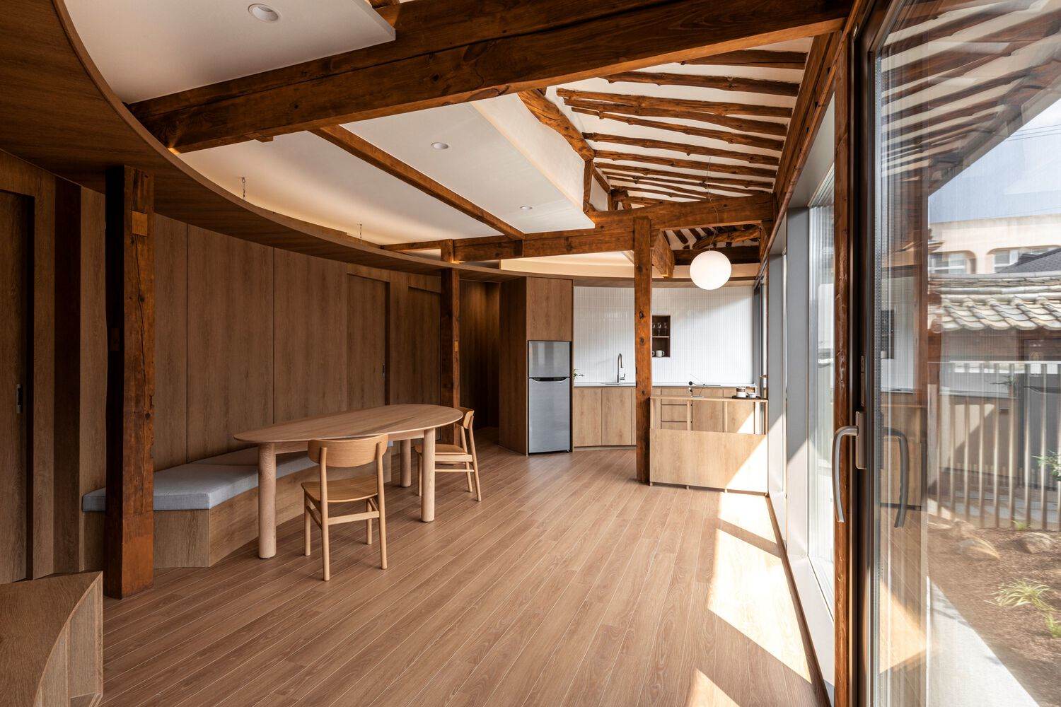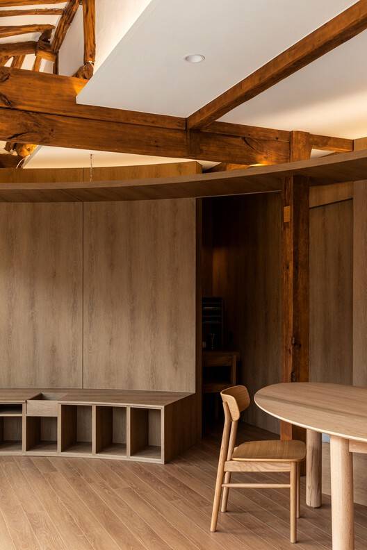 当人推开主大门,踏入这片空间,过渡便从脚下地面的质感,以及木柱、瓦顶与周边景观之间的视觉互动中悄然开启。这些触觉与视觉的线索将人引入屋内,在那里,圆形设计的室内外空间依次展开。每一处空间都宛如一幅精心装裱的画卷,其意境不仅由建筑形态勾勒而成,更得益于精心挑选的材料与陈设,它们与每一处场景相得益彰。