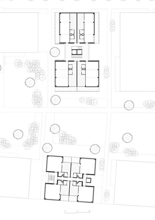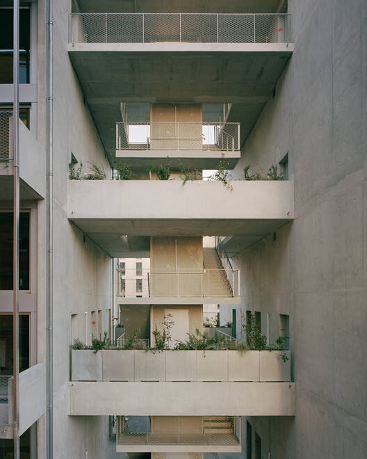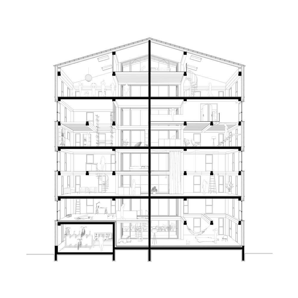 为简化未来夹层的建造,我们预先设置了基础设施:针对每套公寓,我们配备了一个单一的技术竖井,竖井内设有带插头的接口,以便安装卫浴间等湿区设施,同时还安装了独立的暖通空调(HVAC)系统,从而在邻里之间实现最大程度的灵活性与独立性。构想一座建筑的未来,也意味着设想一种共居体系。这里打造的是干净、干燥且对所有人都开放便利的建筑工地,邻居的需求可以通过另一位邻居的技能来满足,这一方案欢迎并适应家庭内部的变化。这是在独特场地中打造的一种替代性居住形式,促使房地产开发以全新视角思考集体住房及其设计模式。