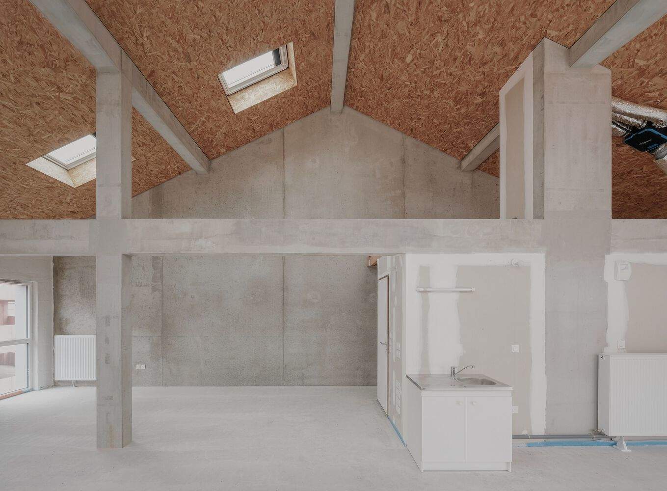Each 'Capable Volume' is divided into two independent areas, each with its own entrance door and separated by a removable interior wall. The first area is the basic unit, which complies with current building regulations and can be immediately occupied. The second area serves as a large-scale spatial reserve that can be easily expanded and transformed into diverse residential spaces. Starting from the basic unit, each family will gradually create their own complete 'functional space'. As time goes by, the mezzanine gradually appears, extending significantly above the living room, and can then be subdivided into new rooms until it reaches a maximum area of 90 square meters in the proposed smallest unit, and can be expanded to 150 square meters in the largest unit.