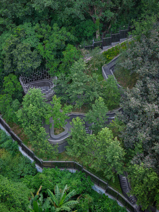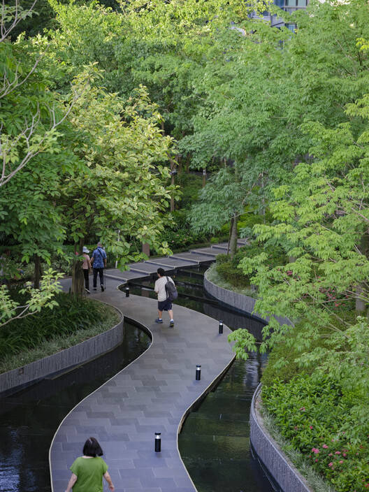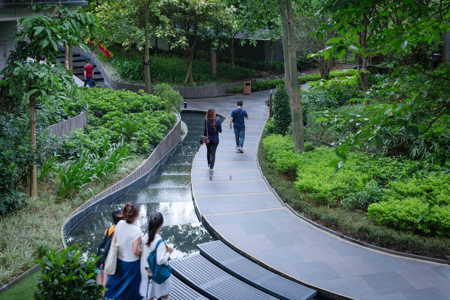 Le Pont 的亮点在于其蜿蜒曲折的步道,该步道仿效了山地徒步的体验。步道两旁绿树成荫,茂密的绿植形成天然华盖,而精心设计的水景更为这条步道增色不少,让人联想到受大榄涌及其变幻莫测的潮汐岛屿启发而打造的层叠瀑布景观。这种以感官体验为导向的设计放大了静谧之感,潺潺流水声让人放松身心,与自然建立深刻的联结。