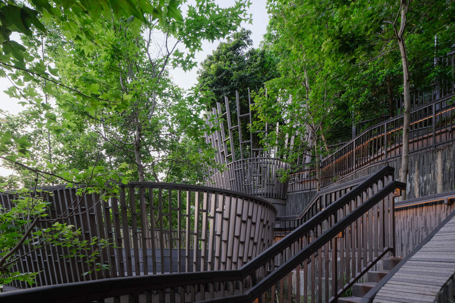 The highlight of Le Pont is its winding trail, which imitates the experience of mountain hiking. The green trees on both sides of the trail provide shade, and the dense vegetation forms a natural canopy. The carefully designed water scenery adds a lot of color to this trail, reminiscent of the cascading waterfall landscape inspired by Dalan Creek and its ever-changing tidal islands. This sensory experience oriented design amplifies the sense of tranquility, with the sound of flowing water relaxing the body and mind, establishing a profound connection with nature.