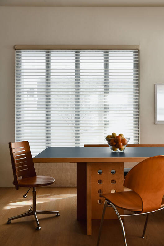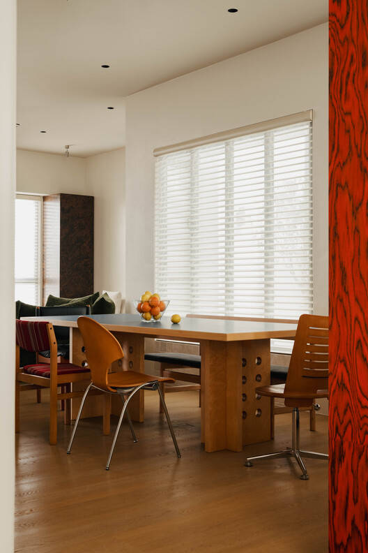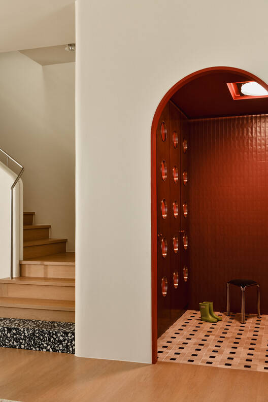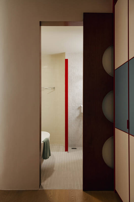 与此同时,入口处被精心设计成一个颇具仪式感的过渡空间。受弗兰克·劳埃德·赖特(Frank Lloyd Wright)“压缩与释放”设计理念的启发,门厅运用色彩而非造型来营造空间张力。其墙面被涂以浓烈的红色,营造出一种包裹感和私密感,随后将人引入内部开阔宁静的空间。步入其中,柔和的米色背景成为表达个性的中性画布。这种视觉上的宁静,让家中精心挑选的物件 —— 每一件都因其造型、故事或气质而被选中 —— 得以大放异彩。这些元素并不刻意夺人眼球,而是彼此和谐相融。它们如同点缀在家中的雀斑,以低调的方式展现韵味,却从不喧宾夺主。