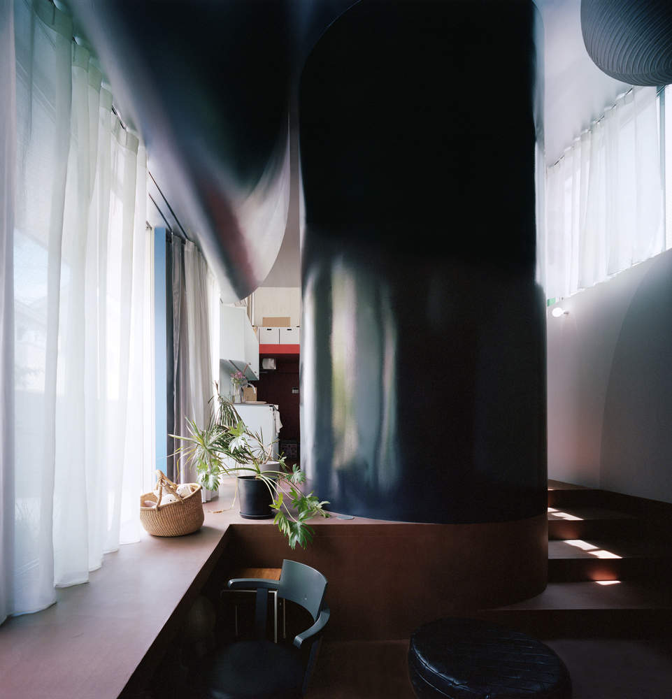 这个装饰空间,由于黑色圆柱体造成的视觉空白,只能部分被感知,随着视角的改变,会产生一系列无穷无尽的碎片图像。 与此同时,通过日常生活,这些图像在脑海中积累,使住户对空间的感知越来越具体。