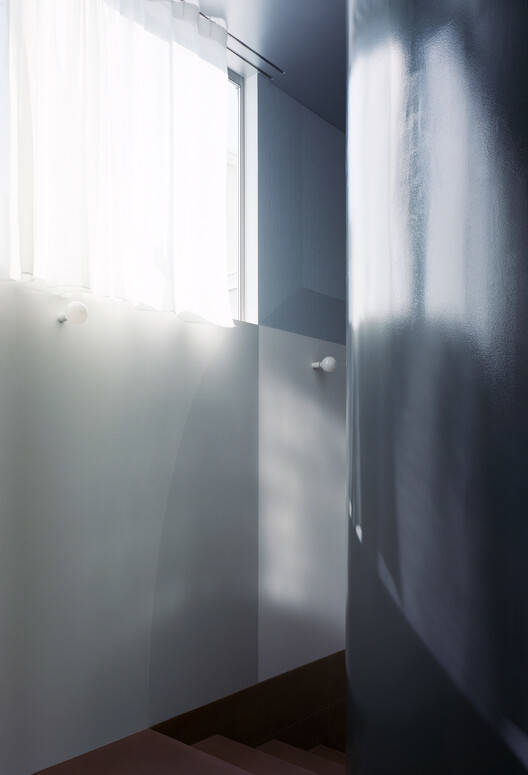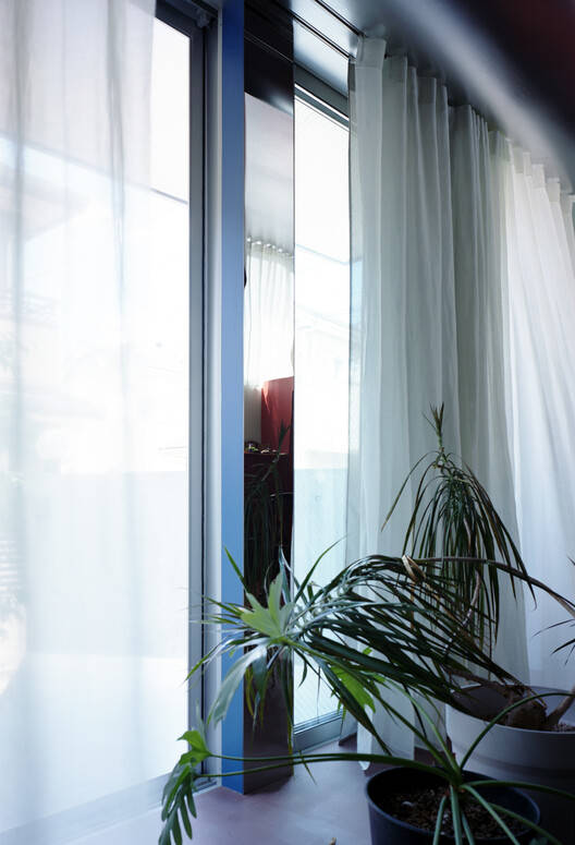 在这个黑色圆柱周围是各种装饰元素。 例如,面向小巷窗户上方的银色水平圆柱体既是一个反射表面,可以漫射高窗户的光线和花园的景色,又是一个管道空间。 厨房里的一面镜子安装在蓝色的柱子上,这样厨房里的人就能看到客厅的情况。 北侧的元素,如厨房和圆柱,被镜像并转置到南侧的内部墙上。