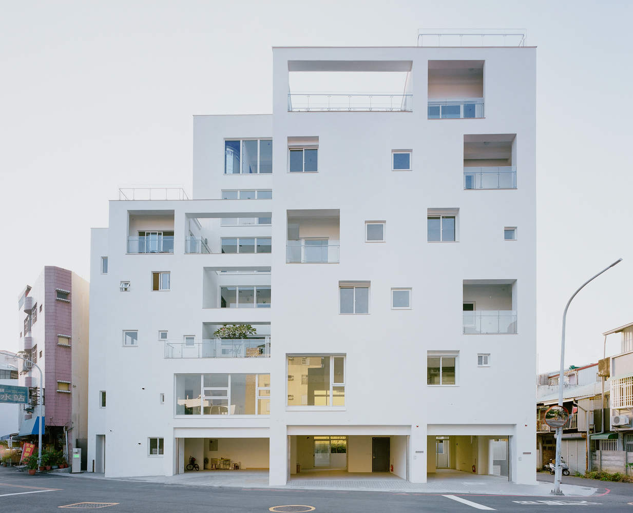 The building consists of one basement level and six above ground levels, consisting of two volumes - a typical mixed use building type commonly seen in southern Taiwanese cities. The front unit is a two-story commercial residential building, facing the street and park, while the residential entrance is located at the back of the building, along a relatively quiet side alley, achieving the separation of the commercial and residential areas.