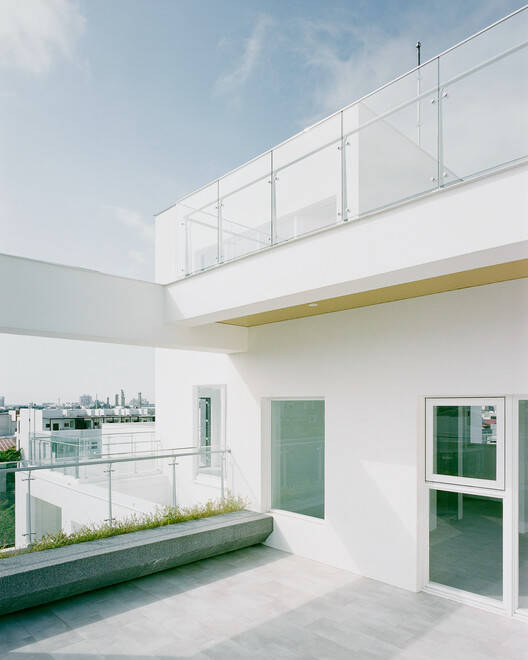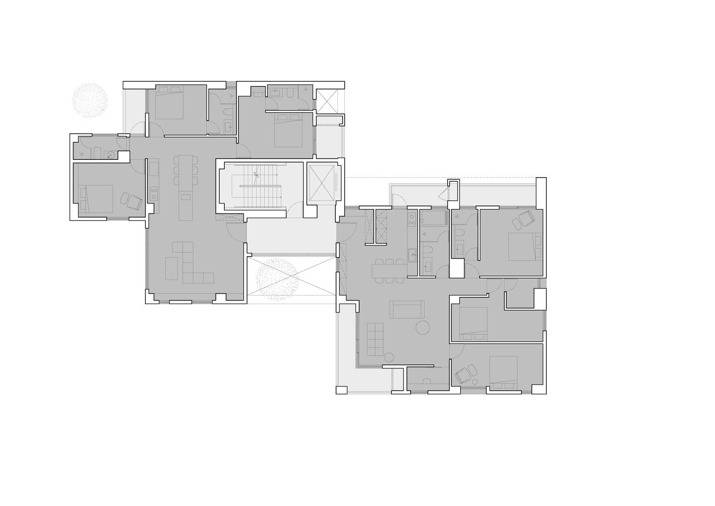 To maximize space utilization efficiency on a compact site, a sloping ramp has been installed in the basement for parking. On the ground floor, the building extends completely to the street, while slightly retreating from the rear boundary line to maintain a certain distance from adjacent buildings. Above, two residential wing buildings are arranged in a staggered manner in the vertical direction. This subtle misalignment design creates a certain degree of separation between each unit, ensuring the privacy of residents and promoting gentle spatial interaction between neighbors.