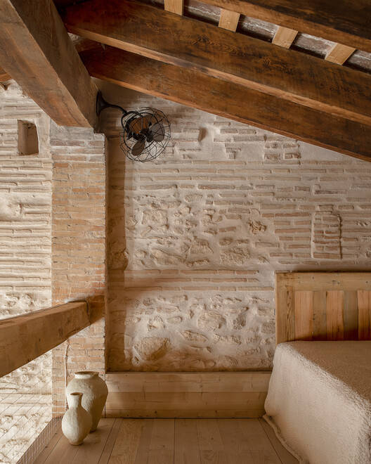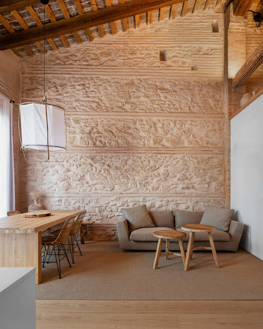 Homu Arquitectos advocates highlighting existing structures and materials. Bare bricks, stones, and wood appear in a pure state, establishing a dialogue with new interventions. In addition, the design team enhances the warmth of the space through indirect lighting.