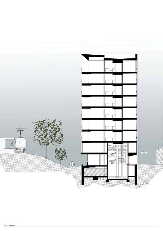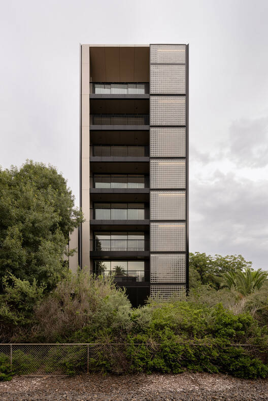 The Newburgh Tower of Light is located in Auburn Village, Melbourne, Australia, with a prime location that offers a highly sustainable housing solution. It can accommodate 21 people on a nearly impossible 150 square meter site and on a historic train station, with a total of 10 floors. Due to the lack of a street entrance, the north facade is directly adjacent to the Victorian Transport Authority, and complex fire safety, building methods, acoustics, uniform lighting, and stability requirements dominate most of the design process. The response is a mini tower type, where each residence has a complete floor and uses glass bricks as a key material to meet fire and lighting requirements. Conceptually, the semi transparent exterior wall combined with the entire reflective finish forms a lantern in the public domain, while creating a brief effect within the residence.