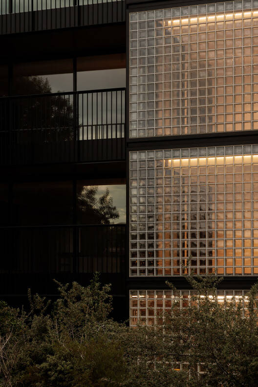 模块化与材料运用的精妙:项目在设计中充分运用了模块化设计,并结合预制构件、玻璃砖面板和可操作的嵌入式玻璃,以实现建筑的简洁性和高效性。南北立面采用半透明设计,配合极简的核心筒,营造出通透的视觉效果,并最大程度地引入自然光线。同时,建筑材料的选择也颇具匠心,如现浇混凝土的使用,既保证了建筑的结构安全,又为底层公共空间提供了坚实的基础。内部材料方面,木质镶板、天然石材和陶瓷瓷砖的运用,营造出温馨舒适的居住氛围,与外部的玻璃砖形成鲜明对比,进一步丰富了建筑的视觉层次和光影效果,从而强调了材料本身的质感。