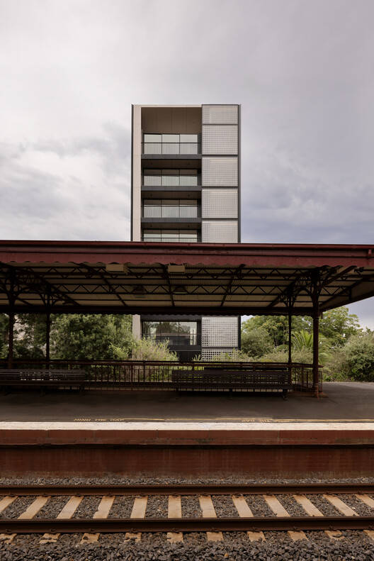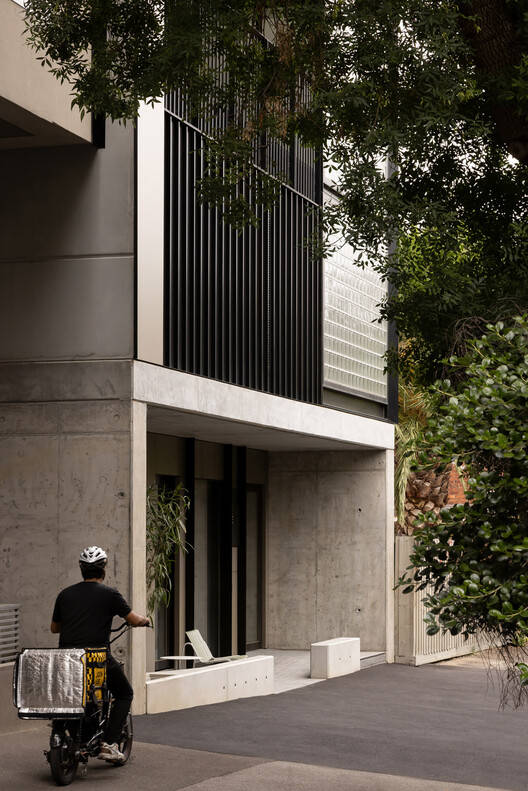 Cast in place concrete was selected for its ability to withstand train derailment, forming the ground level and equipped with integrated seats to activate the small coffee shop in front of the entrance and pedestrian railway connection line. The cobblestone road paved with bluestone extends from the alley on one side to the sidewalk on the other, forming a complementary pixelated pattern that emphasizes maximum bottom layer permeability despite the small size of the plot.