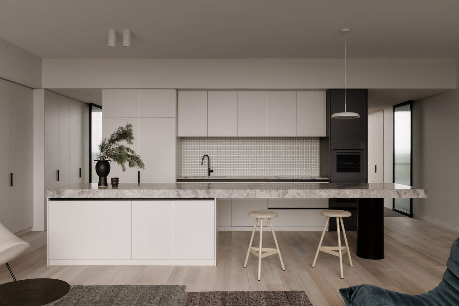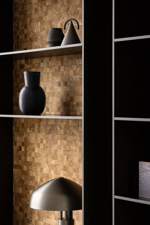 建筑网格的语言通过木质镶板、天然石材和瓷砖应用于室内材料调色板。 玻璃砖呈现出独特的内部装饰,全天都能创造出灿烂多变的光线效果。 通过纹理玻璃门和内墙实现光穿过地板的渗透性。 上层是定制的顶层公寓,一栋住宅有两层,尽管建筑物的模块化效率很高,但仍然保有其独特性。