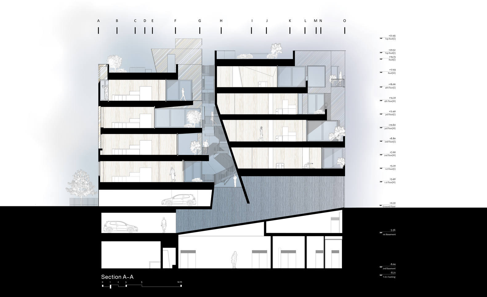 项目力求融合独立却又互补的元素,使其不断互动。这些元素的独立性既有助于保持通透性,也有助于保持其“别墅式”的本质和特性。这也使得每层的两个单元能够独立存在。因此,每个单元的设计都独一无二,但它们都受到相同形式语言和空间特质的启发。