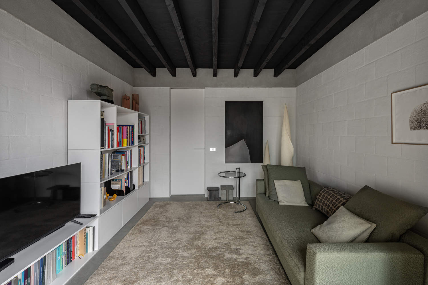 这座房屋的装修细节处理备受关注。在多个房间内,结构构件均保持原貌、清晰可见。例如,施工方决定在砌好的砖墙上涂刷一层漆,而非进行抹灰处理。这一施工步骤在工程初期就需要特别留意,以便为后续的电气工程作业做好准备。屋顶的承重结构被特意保留且在高度上做了错落有致的设计,在展现结构之美的同时,又巧妙地隐藏了施工工艺细节。最终呈现的效果是:室内空间高挑,营造出宽敞通透的居住氛围。