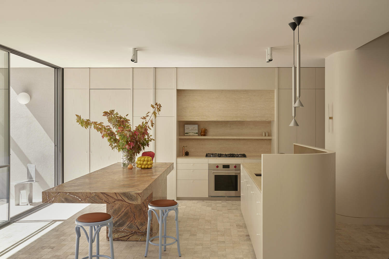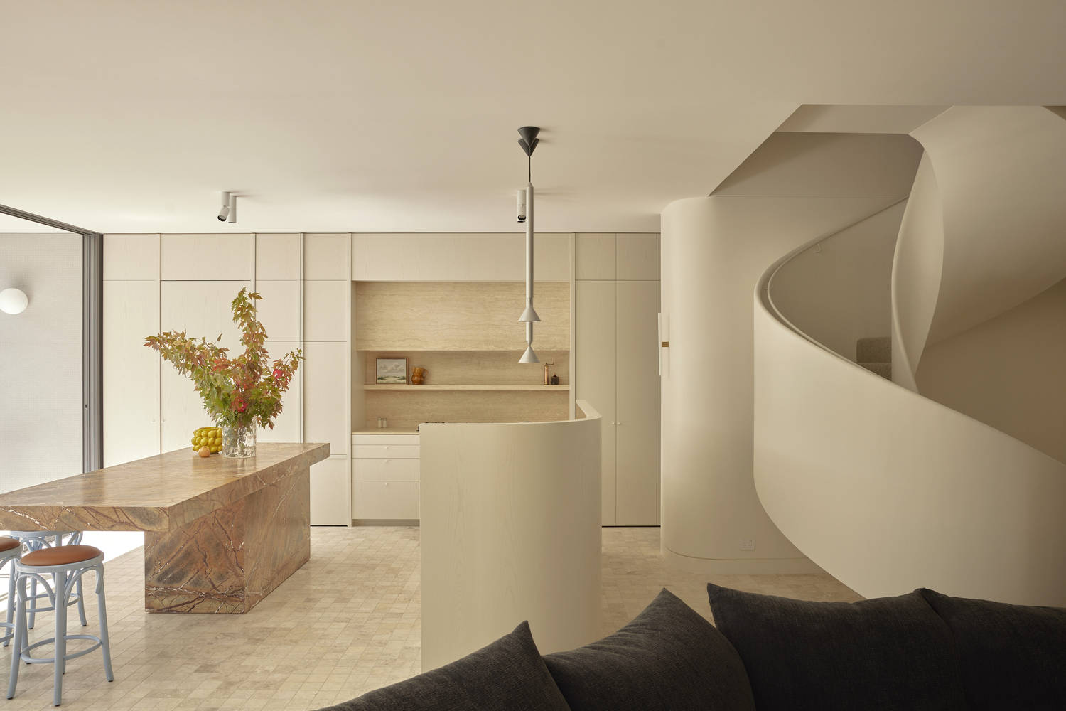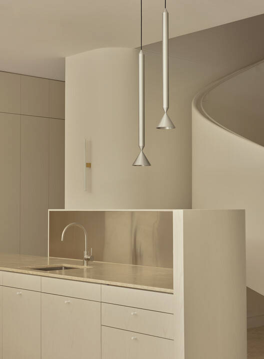 一楼摒弃了传统的木地板,采用小尺寸的石材铺装,营造出一种以材质为基础的统一凝聚力,并从居住者醒来的那一刻起就为他们带来一种接地气的感觉。最终完成的项目是一个轻松提升日常生活体验的家,一个凝聚力强、令人平静、充满仪式感的家。