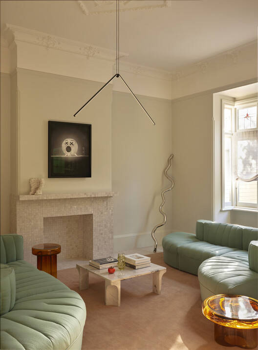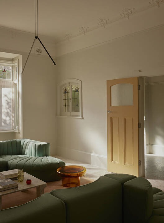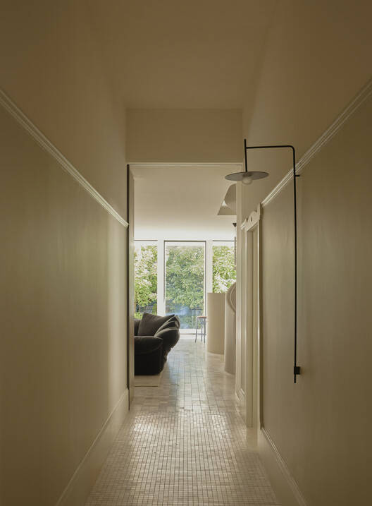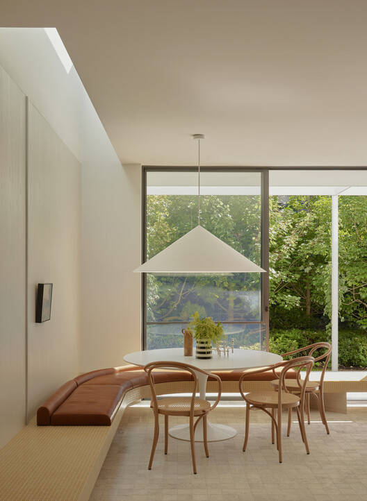 传统的正面被剥离,展现出奇特的联邦风格细节和无可挑剔的比例,这些特征通过色彩的层次运用和实体元素的层次感——装饰照明、定制细木工制品和柔软的可移动家具——得以强化。与花园相连的后部被体验为一系列独立而又相互连接的区域,细木工元素在与外部相连的更大、更具凝聚力的空间环境中,提供了暗示性的功能和足够的空间定义。该设计巧妙地提升了日常生活的体验:健身房和洗衣区俯瞰着郁郁葱葱的绿地,步入式淋浴间透过上方6米高的天窗洒满阳光,前部的起居室致力于营造宁静的庇护所,是减压、沉思和聚会的场所。