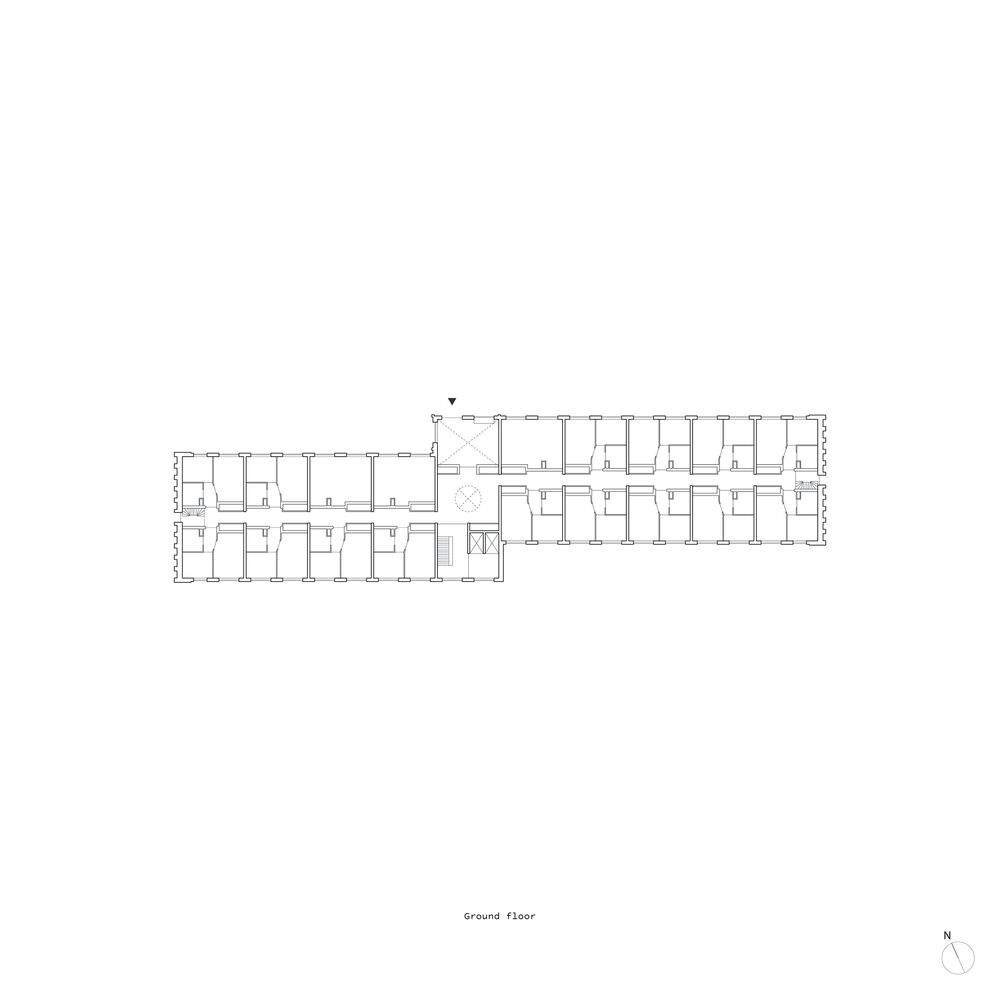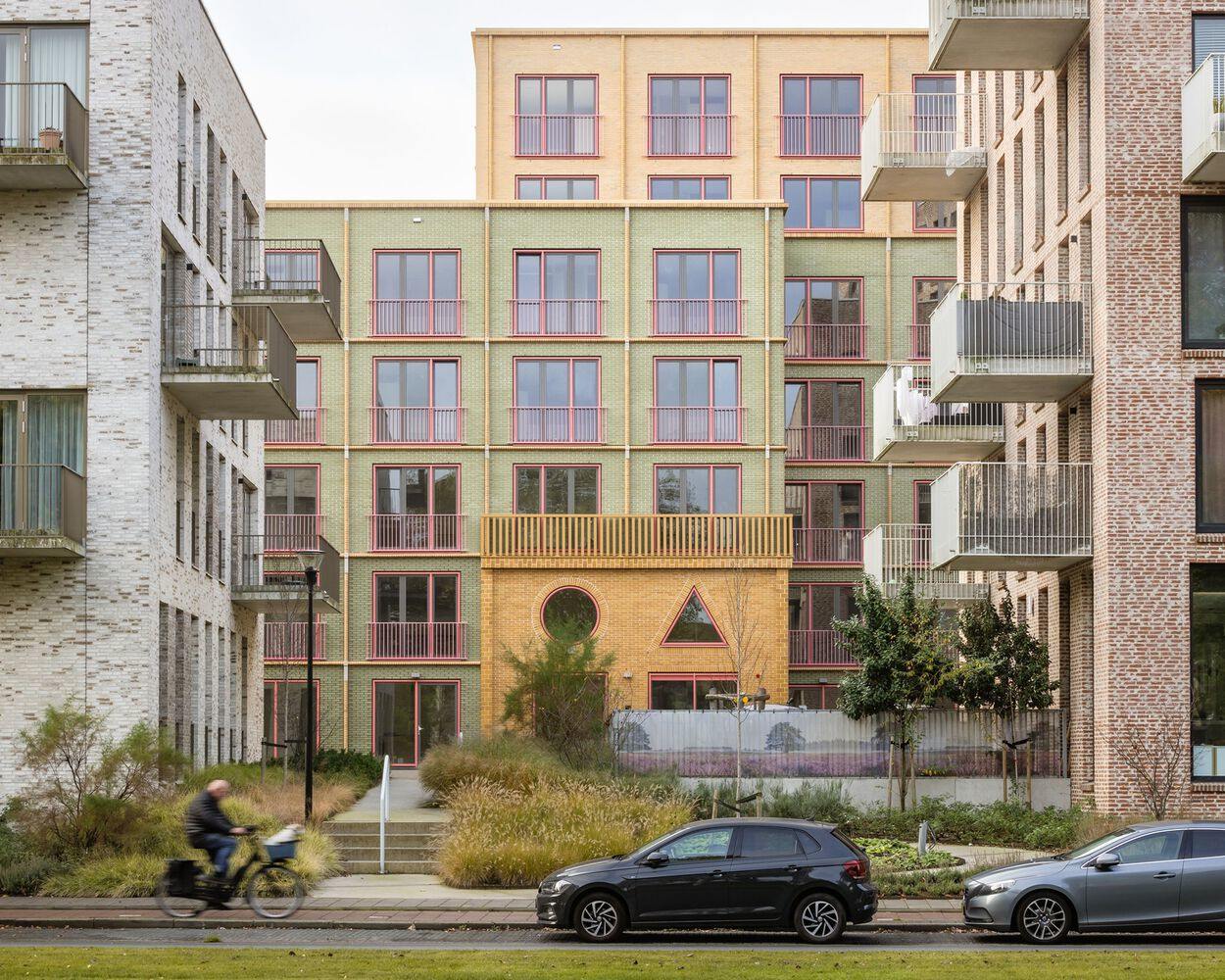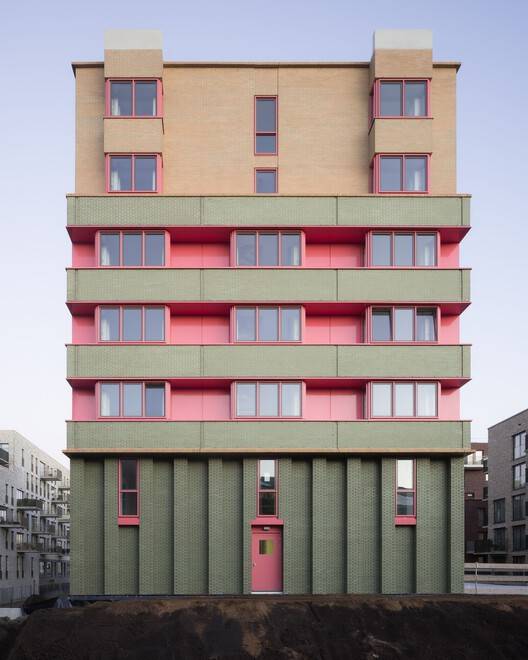 这些紧凑的公寓通过从建筑中央大厅(大厅中央设有一个圆形中庭)延伸出的走廊进入。纵向的建筑立面通过明快、乐观的色彩与细腻的质感层次,呈现出丰富的视觉效果。优雅的砖砌细节不仅坚固耐用、高效实用,而且是从建筑建造工艺的角度出发进行构思设计的。上升的墩柱与横向条带的图案由特殊形状的砖块砌成,节点处经过抬高处理,打造出一个精巧的元素,提升了立面的触感与尺度感。