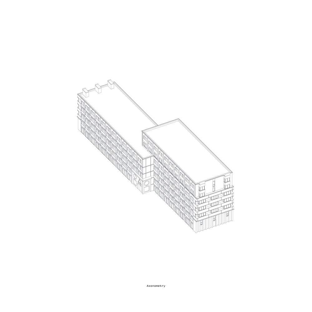 The building with 108 units in the middle is the final work of the development project, built on the roof of a parking garage. This narrow building consists of two parts, carefully designed and cleverly embedded between other buildings. While fully utilizing the available space, it also ensures sufficient lighting and open views between the buildings.