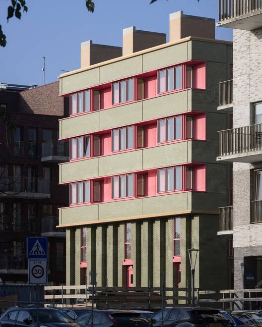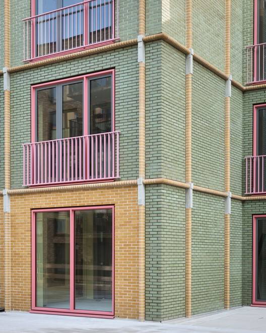 立面设计与材料运用:项目的立面设计是其亮点之一,设计师通过大胆的色彩搭配和富有质感的材料运用,赋予了建筑独特的视觉魅力。明快、乐观的色彩和细腻的质感层次,使得原本单调的立面变得生动而富有活力。优雅的砖砌细节是该项目技术与美学的完美结合,建筑师从建筑建造工艺的角度出发,设计了特别的砖块形状,并对节点进行抬高处理,赋予立面丰富的触感与尺度感。这种对材料的精细运用,以及对细节的极致追求,体现了建筑师对建筑品质的严格把控和对社会住宅的责任感。
