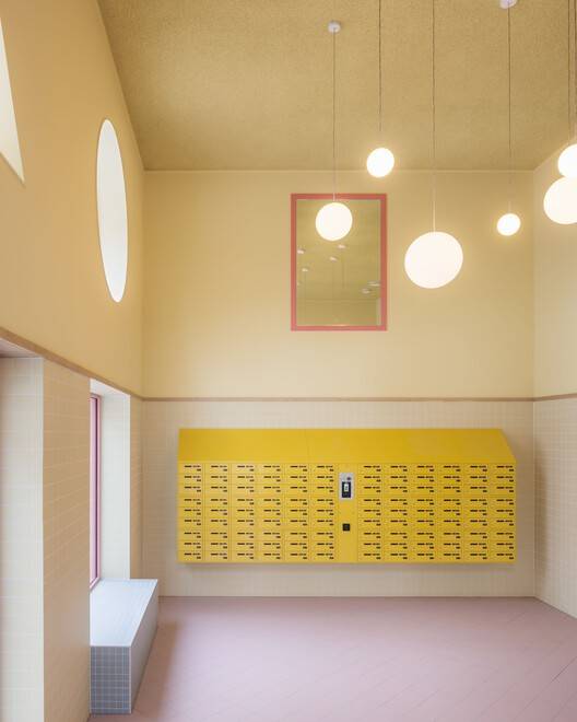 主入口处以色彩对比鲜明的釉面砖和几何形状的立面开口为显著特色。建筑的两端立面形成了富有表现力且醒目的视觉焦点,即便从较远的地方也能轻易辨认。