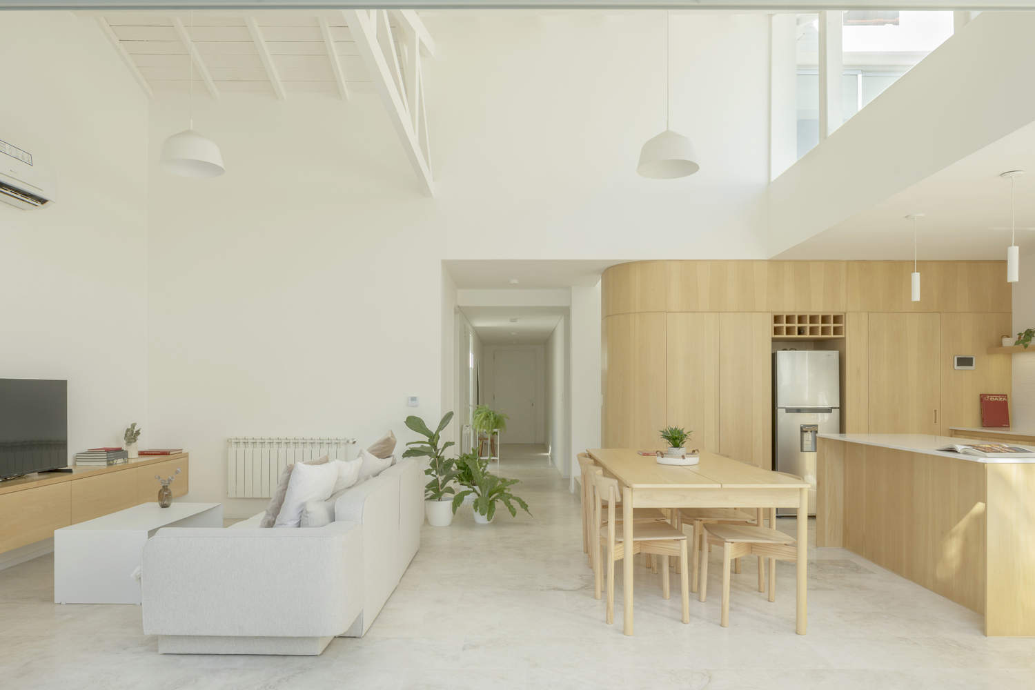 Finally, on the front of the building, a white wall with hidden sliding doors restores the contour lines that echo the neighboring houses, while allowing people to glimpse the ancient tiled roof above, indicating a harmonious blend between the modern language used in this renovation and the preservation of surrounding environmental features.