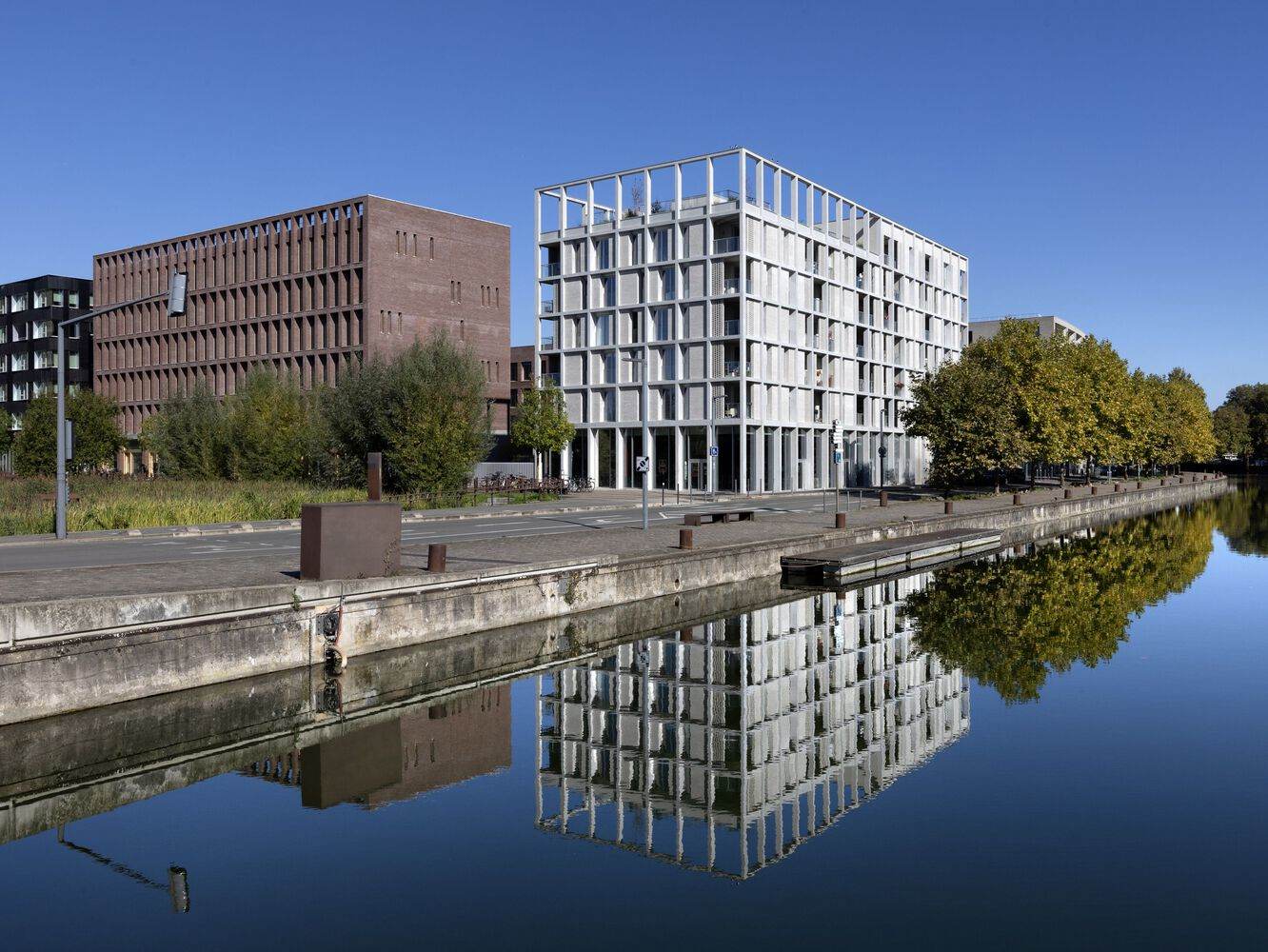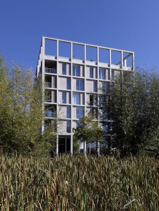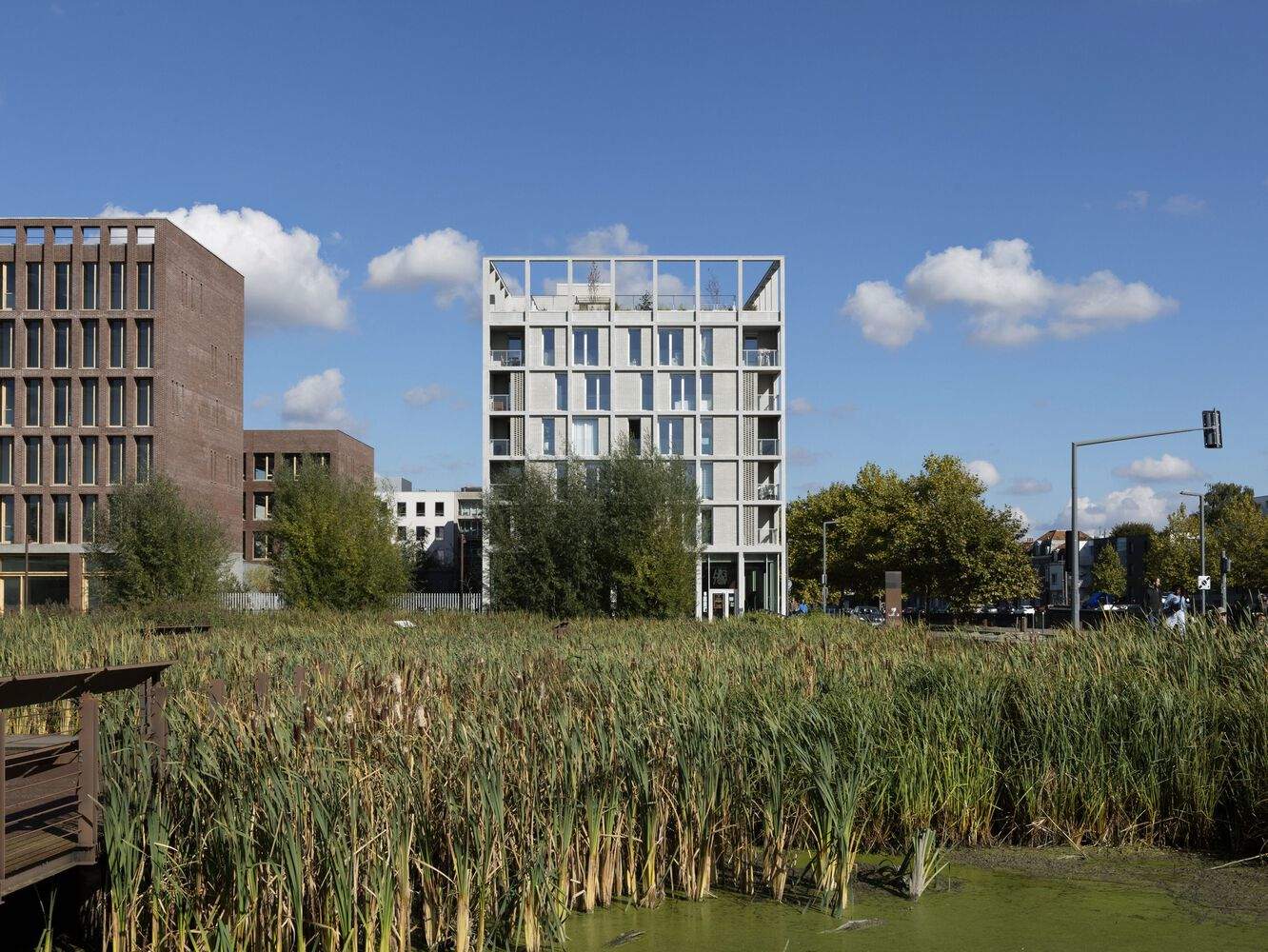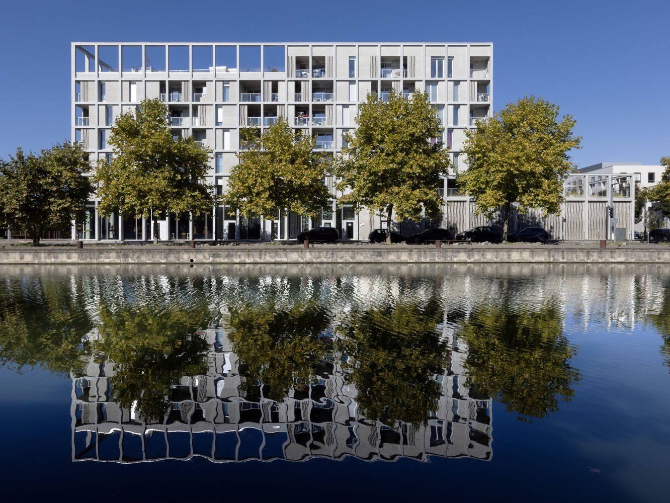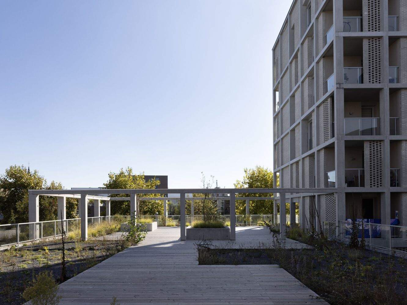 建筑立面采用了混凝土框架结构,这一设计呼应了该地区的工业历史。框架通过中性色调与灰色砖块的搭配,既与周边花园和河流景观相得益彰,又以穆沙拉比耶(Moucharabieh,又称“漏窗式”)砖砌工艺增添柔和质感。这片曾作为纺织业配套工业区的棕地,如今经过精心规划与改造,旨在打造一个可持续且宜人的环境,并通过发展欧洲科技园区(EuraTechnologies,这一数字创新领域的领先枢纽)来助力里尔市更宏大的经济愿景。最终,这里形成了一个生态城区,将住宅、工作场所、公共空间和休闲设施完美融合,同时严格遵循高标准的环境保护要求。