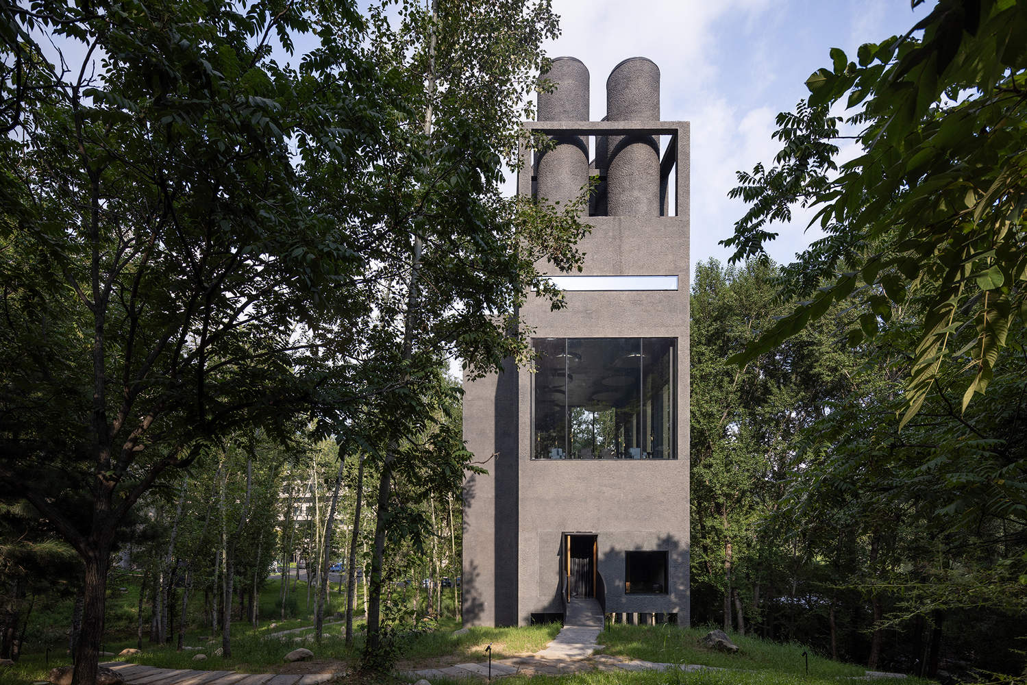 The building is 23 meters high, and eight slender cylindrical light tubes are set on the top to introduce natural light and diffuse downward, creating a dark bathing pool space atmosphere. From a distance in the community, the buildings seem to have descended from the sky, hidden among the mountains and forests, yet maintaining an independent and orderly posture, forming a "dialogue" juxtaposed with nature. Tangquan Space consists of two parts: the west side is a vertically arranged functional area, and the east side is a vertical transportation and service core, connected by a transparent horizontal corridor. The vertically unfolded spatial layout can minimize the base area of the building, while fully utilizing the changes in spatial height, achieving multi-dimensional visual connections between people and poplar trees, cliffs, and distant mountains, establishing a rich perception of nature, and creating a montage like interlayer scene transformation.