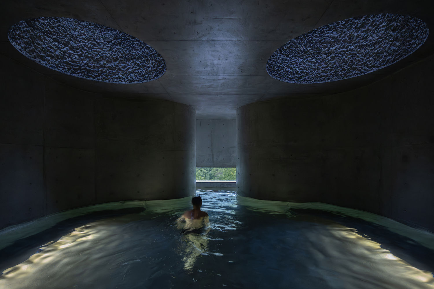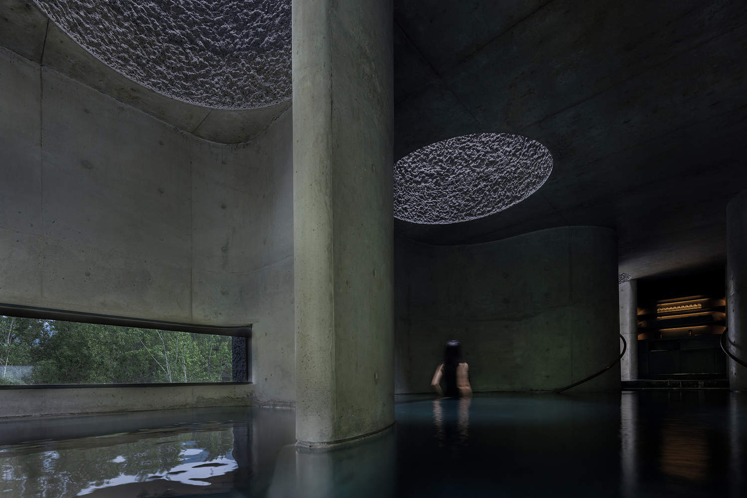 泡汤功能分布于第三层,藏于光筒下的汤池被弧形墙体包裹,包括了不同温度的泡池、冰桶区、淋浴区、挂衣区和饮水处。底部空间幽暗、静谧,天光通过凿毛后的混凝土内壁变得更加柔和,微微照亮至下方的水面,波光反射在弧墙和天花上,光、水、雾在此动态交织,相得益彰。泡汤时,透过西侧的条形长窗,视野可以延展至深谷、崖壁,以及将建筑层层包围的杨树林。