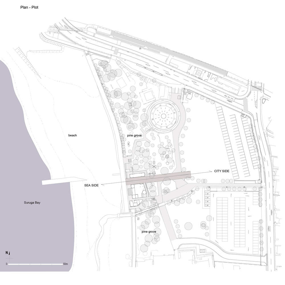 该建筑战略性地坐落于海岸线与松原市中央公园——松原公园(松林)之间的边界上,象征着城镇与大海之间的门户。由于松林是该地区风景的标志性元素,建筑的设计便围绕这些自然元素展开,避免砍伐大直径的松树。建筑布局采用了弯曲松树的3D扫描图像,使得建筑能够与树木共存,同时提供必要的疏散楼层面积。由此产生的设计旨在创造一种与现有环境和谐共存的新景观。