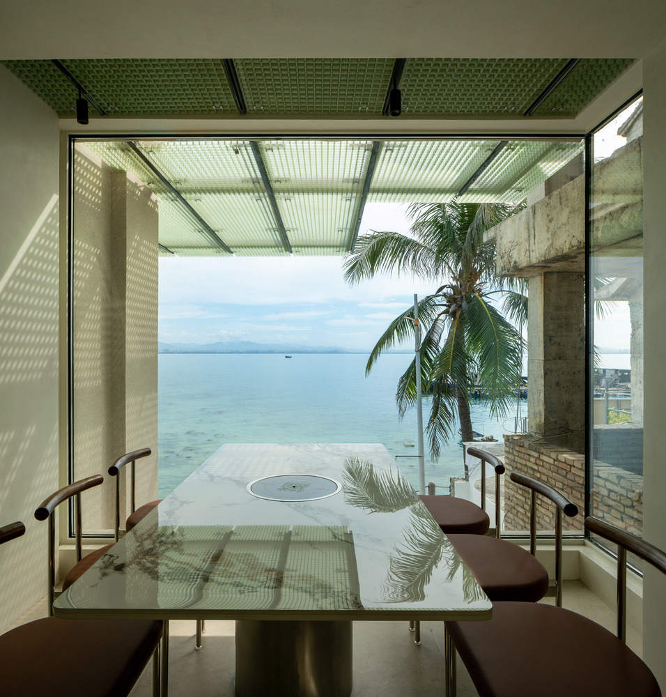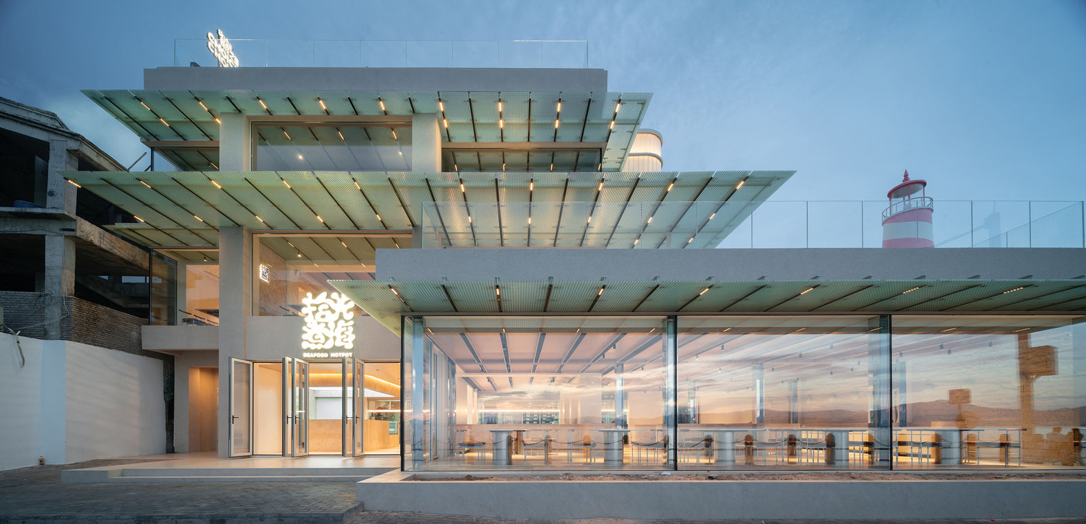 海景与设计的深度融合:该项目最引人注目的亮点在于其对海景资源的极致利用和对情绪价值的深刻挖掘。设计师并未止步于简单地利用海景,而是通过立面设计、室内布局以及材料选择,将建筑与大海紧密联系起来。面向大海的立面采用大面积玻璃,最大程度地消除了视觉阻碍,使室内空间与海天一色融为一体。同时,室内座位平行于大海的布局,确保了每一位顾客都能享受到最佳的海景视野。这些设计细节不仅提升了商业价值,更重要的是,增强了人们在海边放松身心的体验,使建筑成为与海洋对话的载体。