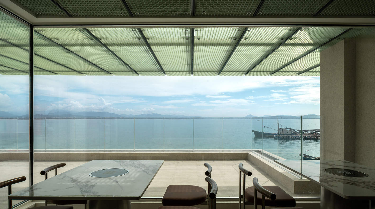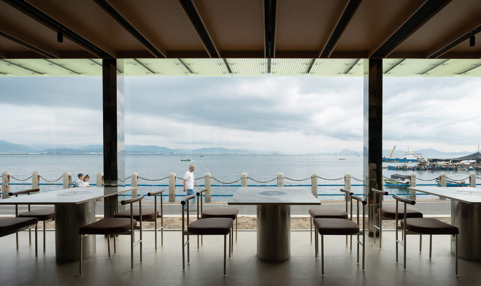 So we try to maximize the advantages of the sea view, with only glass on the facade facing the sea, removing all possible decorative factors that may interfere. At the same time, the layout of indoor seats is parallel to the sea, allowing guests present to enjoy the sea view as much as possible; The ceiling system emphasizes the vertical lines of the sea, which facilitates the sorting of ceiling pipelines and enhances the directionality of space towards the sea surface.