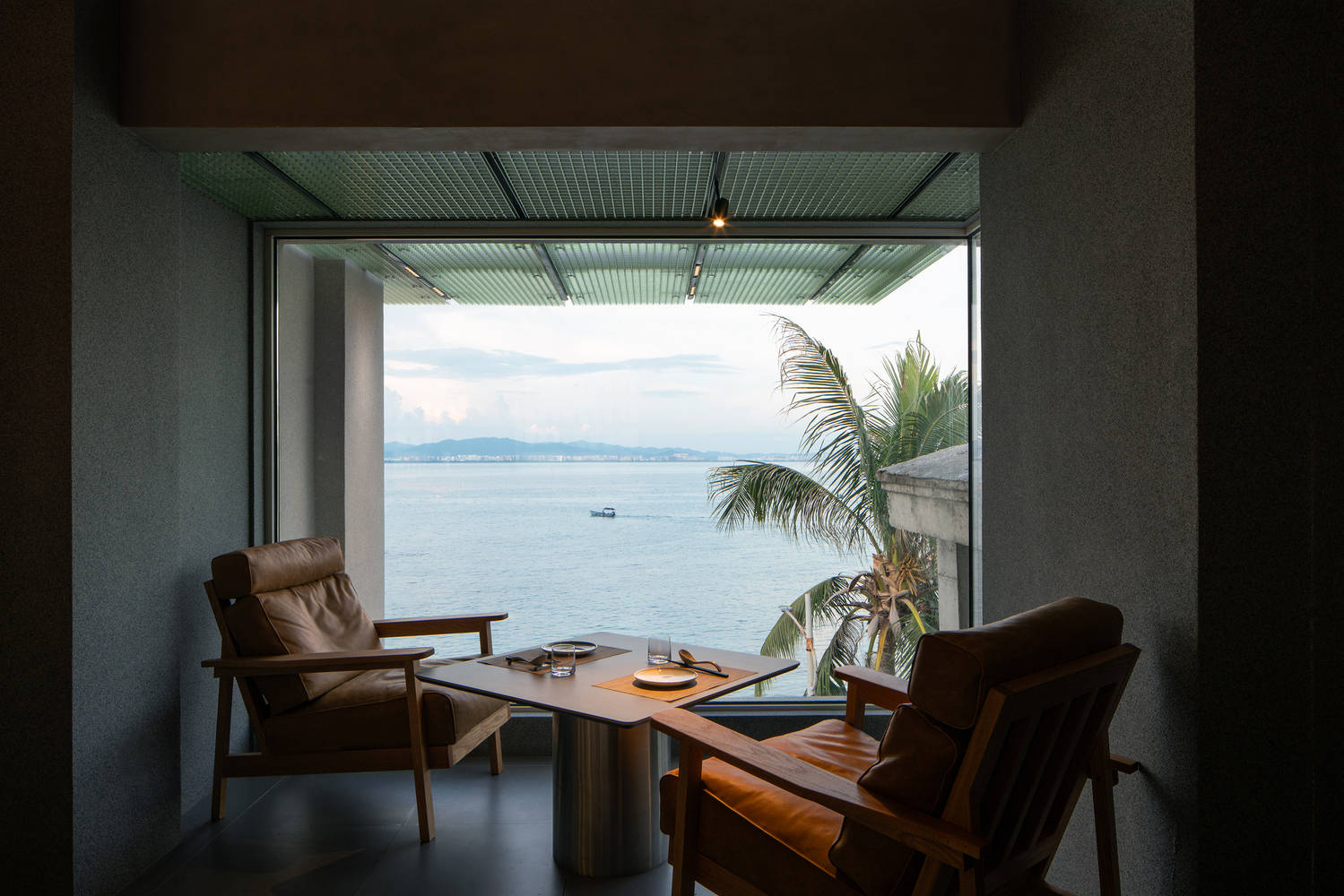 所以我们尽量把海景优势放大,面向海的立面尽量只有玻璃,把一切可能干扰的装饰因素统统去掉,同时室内座位的布置都平行于大海,让在座的客人尽可能的享受海景;天花系统强调垂直大海的线条,方便梳理天花管线的同时,也加强空间冲向海面的指向性。