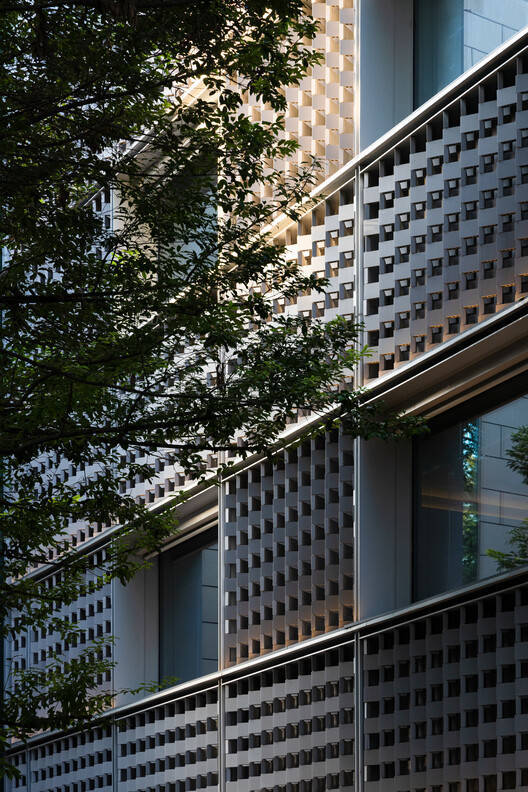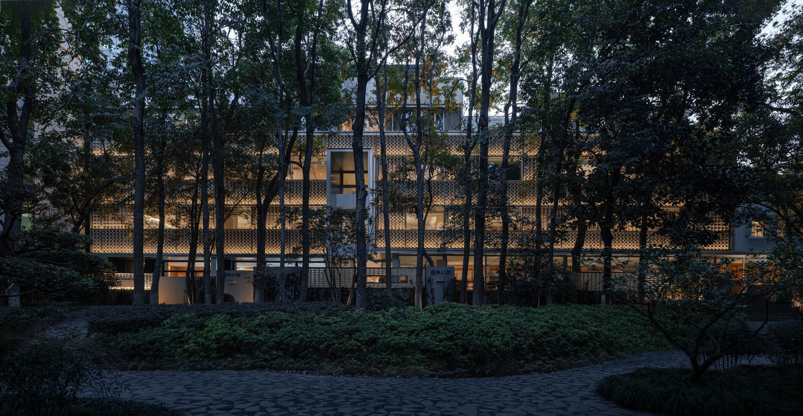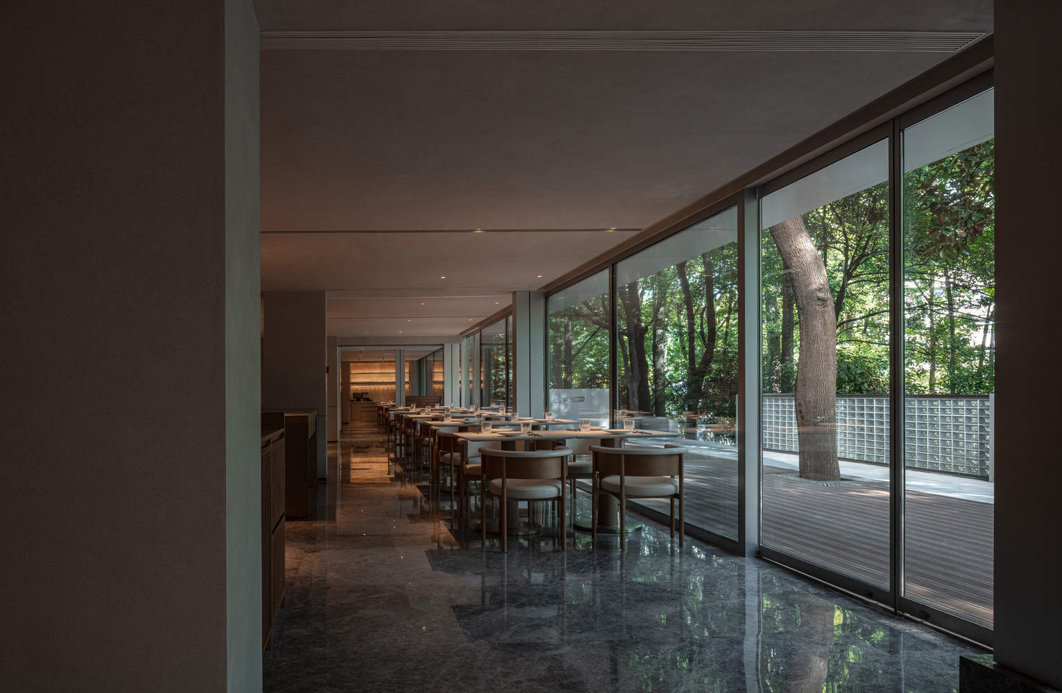 The space above the second floor is mainly composed of independent private rooms, designed to create a visual effect similar to traditional flower windows by combining large area windows with folded ceramic panels. The scenery outside the window changes with the seasons: green shade covers in summer, and red walls are hidden in winter. This design continues the aesthetics of traditional spaces and provides visitors with opportunities to engage in dialogue with nature.