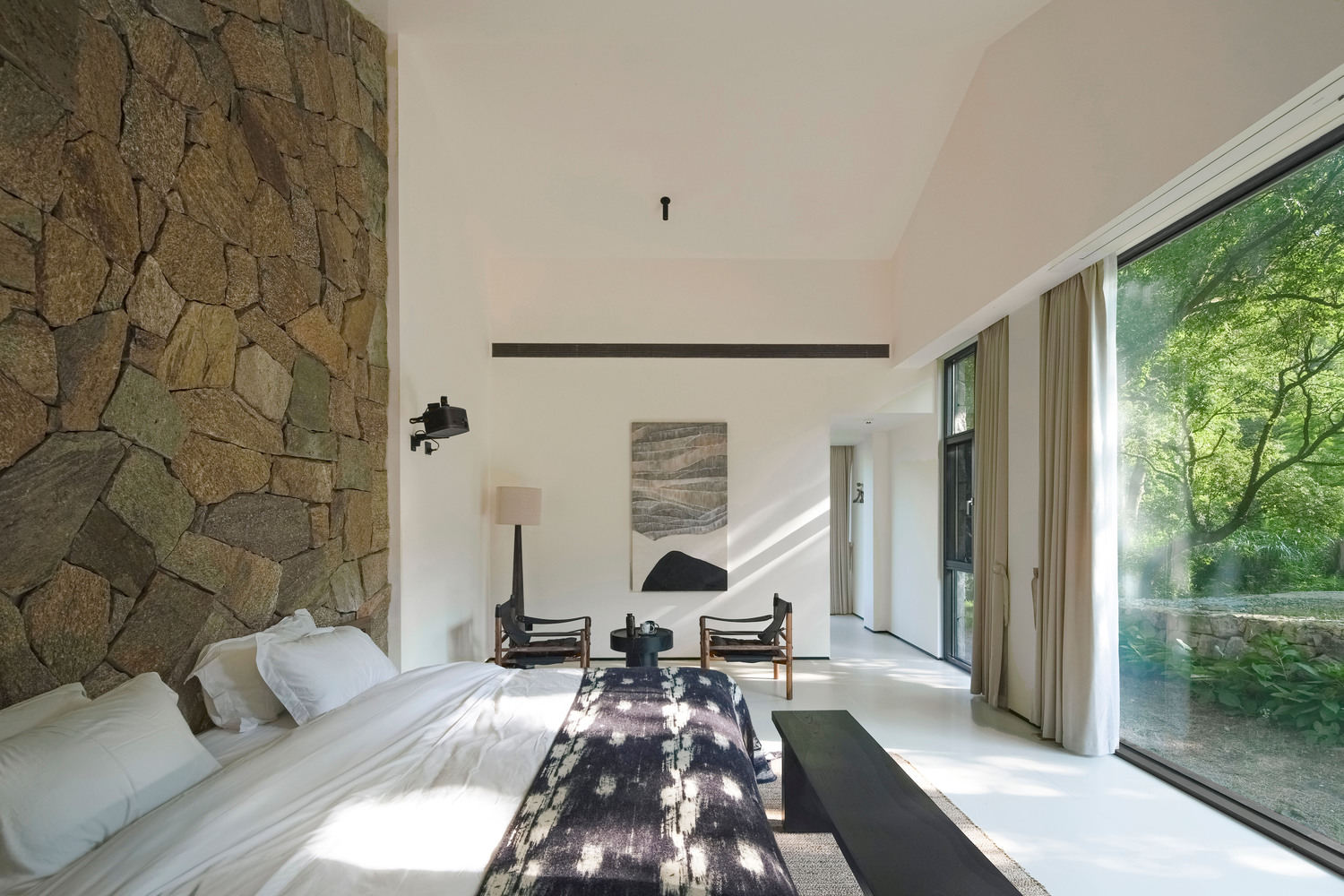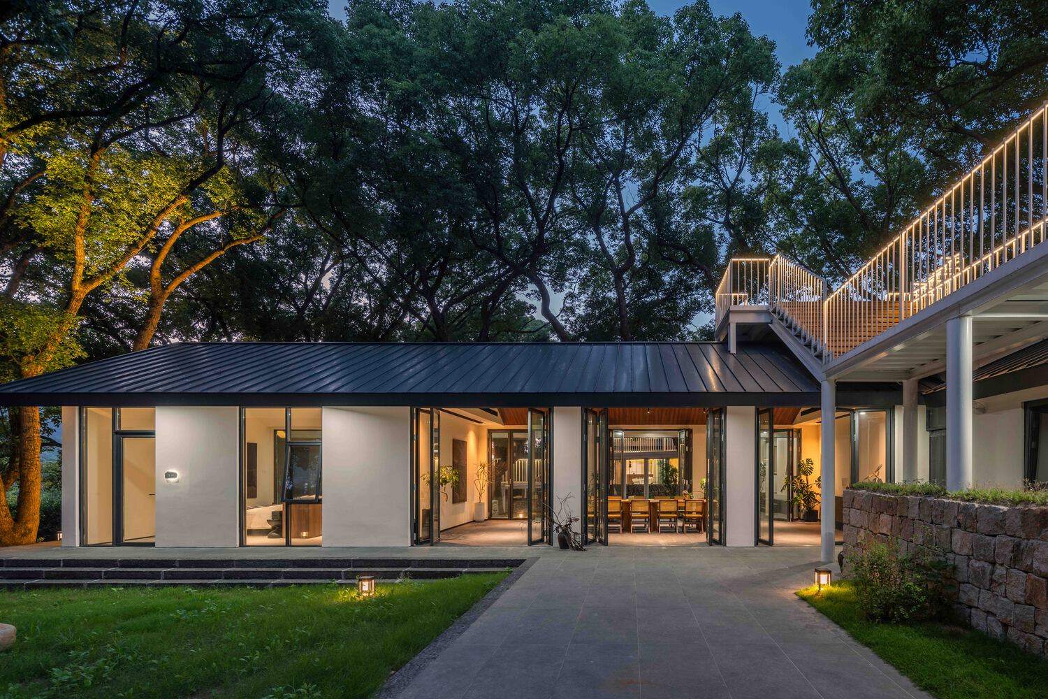 设计理念与自然融合:该项目最突出的亮点在于其对自然环境的尊重与巧妙融合。建筑师将原有荒废的院落改造成为一个与周围48棵老香樟树和谐共生的山野美宿。通过“不强占,也不孤立”的设计策略,建筑与树木建立了六种微妙的相互关系,包括“环抱”、“围合”、“退让”等,体现了对自然的敬畏和对环境的尊重。这种设计理念不仅保留了原有的自然风貌,更让建筑与环境融为一体,让住客感受到与大自然亲密无间的联系。这种设计手法值得借鉴,也为其他建筑项目提供了在自然环境中进行设计的启示。