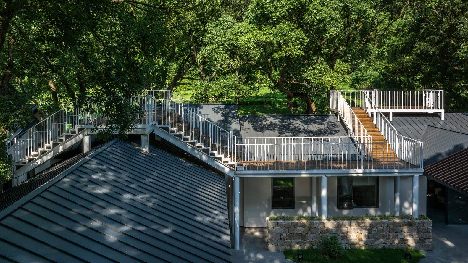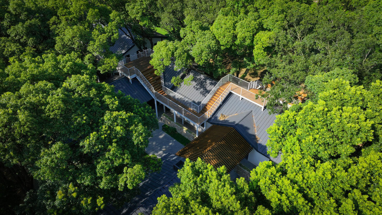 平台随地形高低层叠地“相望”于大树之间,成为空间的景观平台、活动场地。