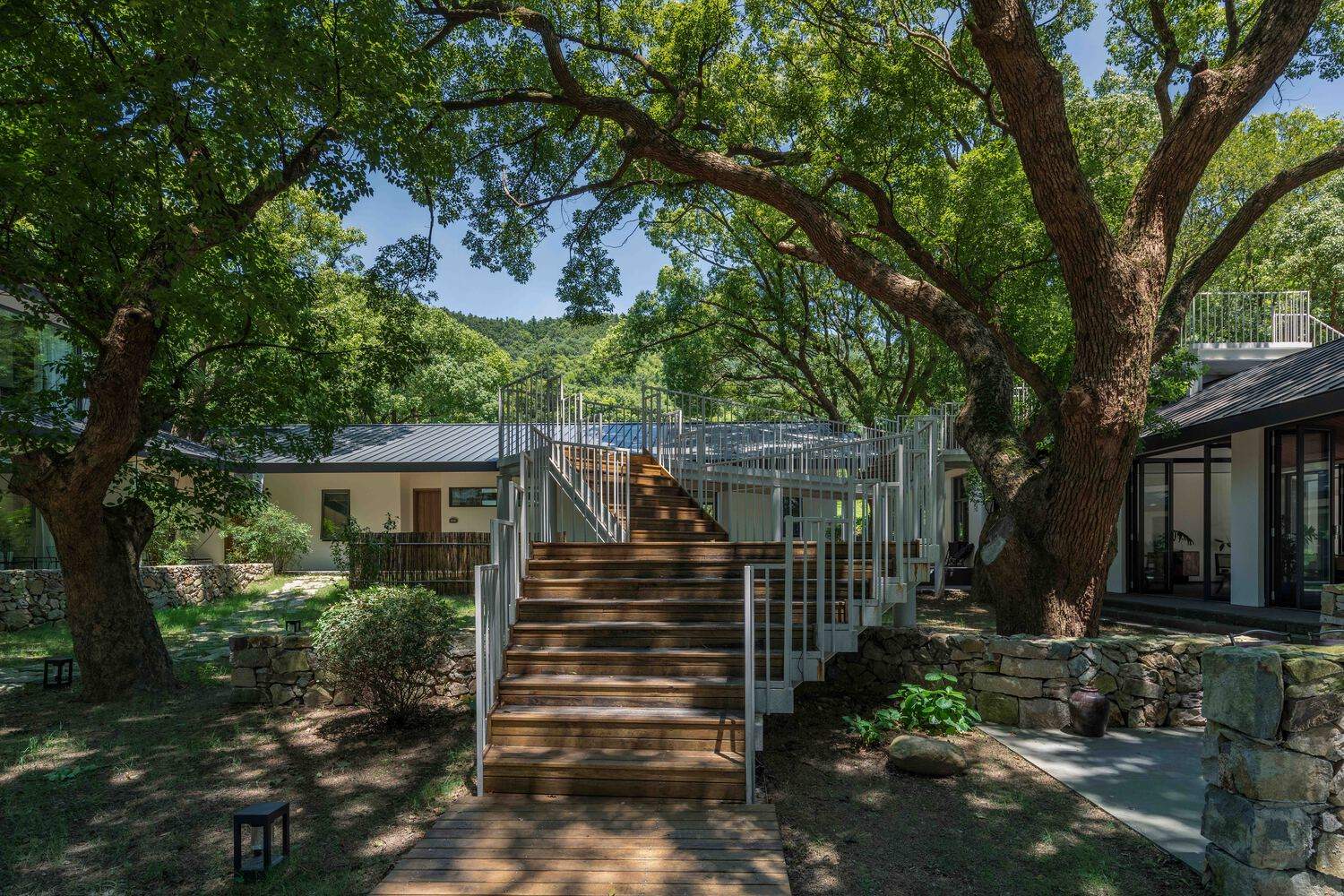 连桥串联三个院落,“穿梭”于建筑、大树之间,它不仅是架构在空间维度的“桥”,也是建构人与建筑、人与自然的“桥”。