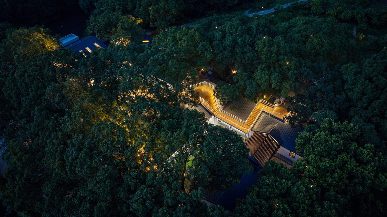 “愈丘”原本是小山丘顶上一个荒废的院子,周围绿树环绕、盘根错节,让它如同置身于 48 棵老香樟树的庇护之下。改造对建筑空间的取舍,取决于“与树”的关系,即不强占,也不孤立。策略有三,首先,将散落的建筑群整合为三进院落,各院落相对独立又紧密联系;其次,模糊建筑空间与自然环境的边界,树中有院,院中有树,让建筑向自然延伸,让自然向建筑渗透;最后,根据空间不同性质为其注入新的功能,在“人为”与“无为”之间架起感知的桥梁。