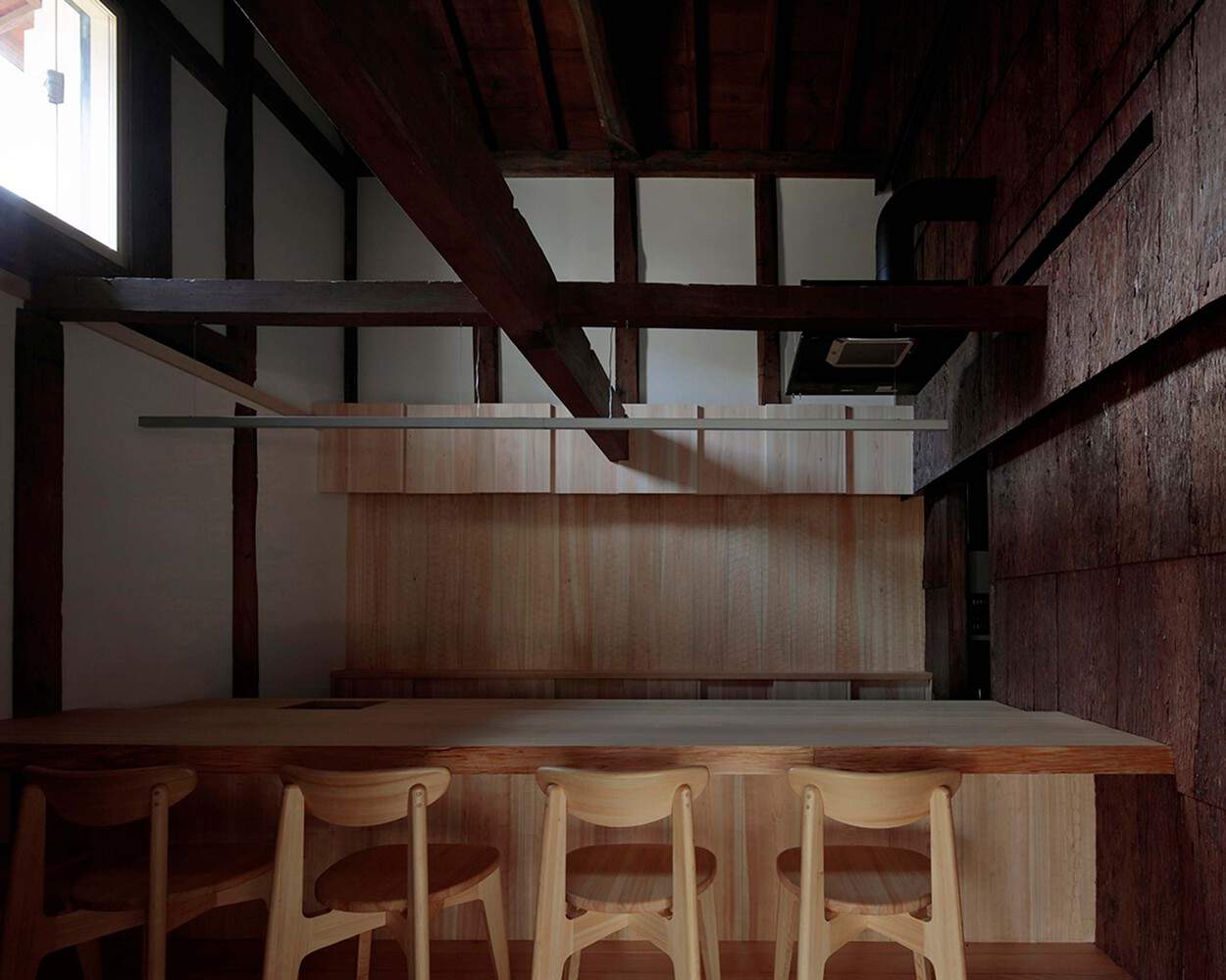 This agricultural warehouse has maintained its original appearance since the late Edo period. In order to respect this important historical background, the design team has decided to carefully restore the facade and the original door using the same traditional materials. In order to accommodate the restaurant, we removed the floor of the second floor and created a skylight, enhancing the space and lighting sense while showcasing the beautiful wooden skeleton structure. The dismantled wooden floor was later renovated and used as a cladding material for the surrounding walls inside. The wall facing the counter is covered with locally grown cedars. The overall feeling is like standing on a very ancient tree trunk, giving people a warm and safe feeling.