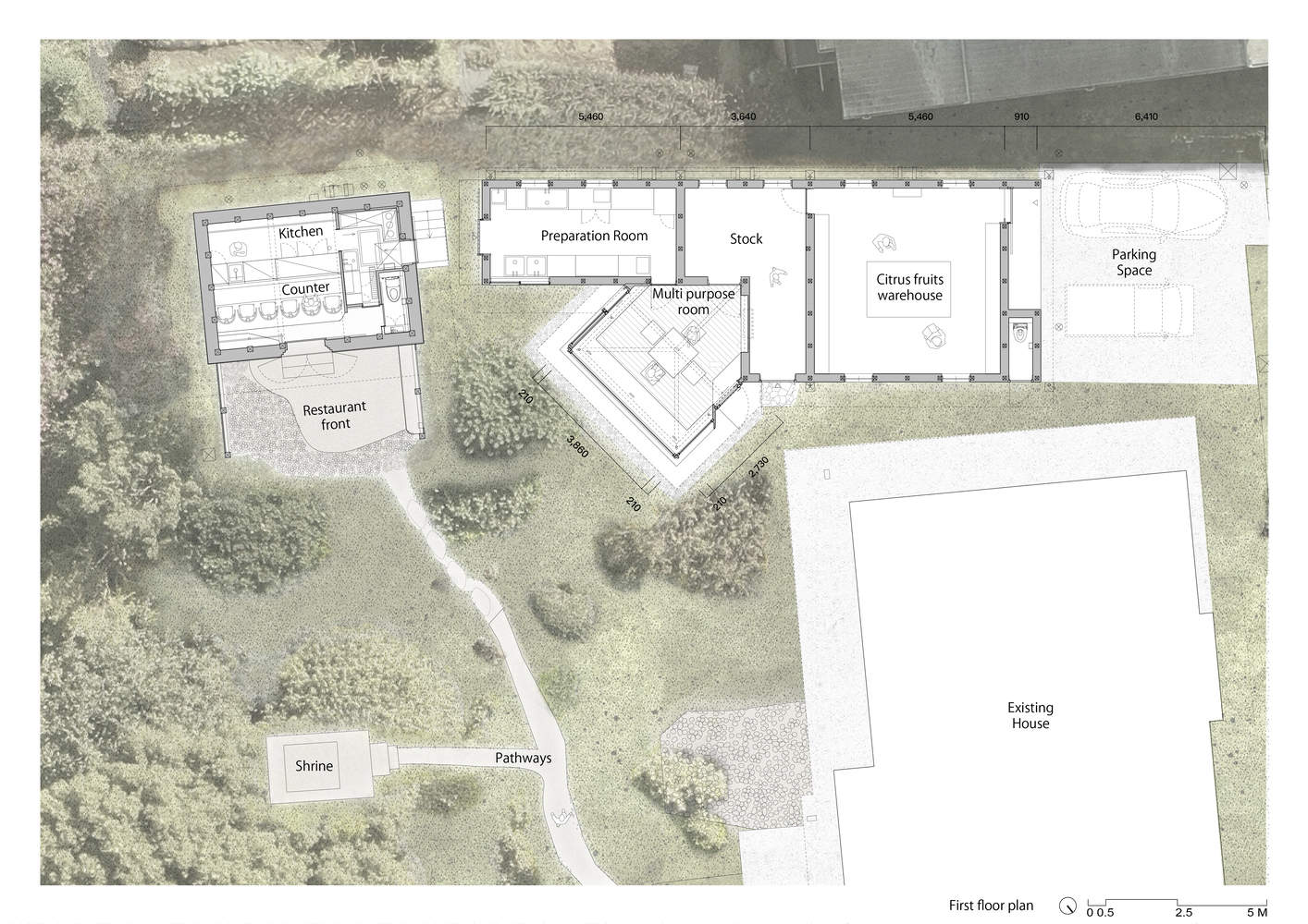 该项目旨在对原有的农业仓库进行翻新,改造成餐厅,并新建一座仓库,用于存放和转换当地生产的蔬菜和水果。为了理解和展现这一浓厚的背景,设计团队找到了地块的老照片和规划图,并决定以此为参考:树木被移植回原来的位置,旧的桥石被重新利用,形成小径和台阶。