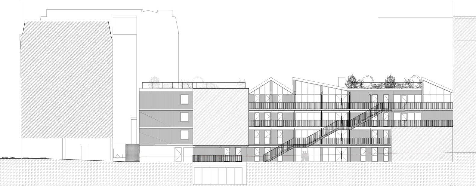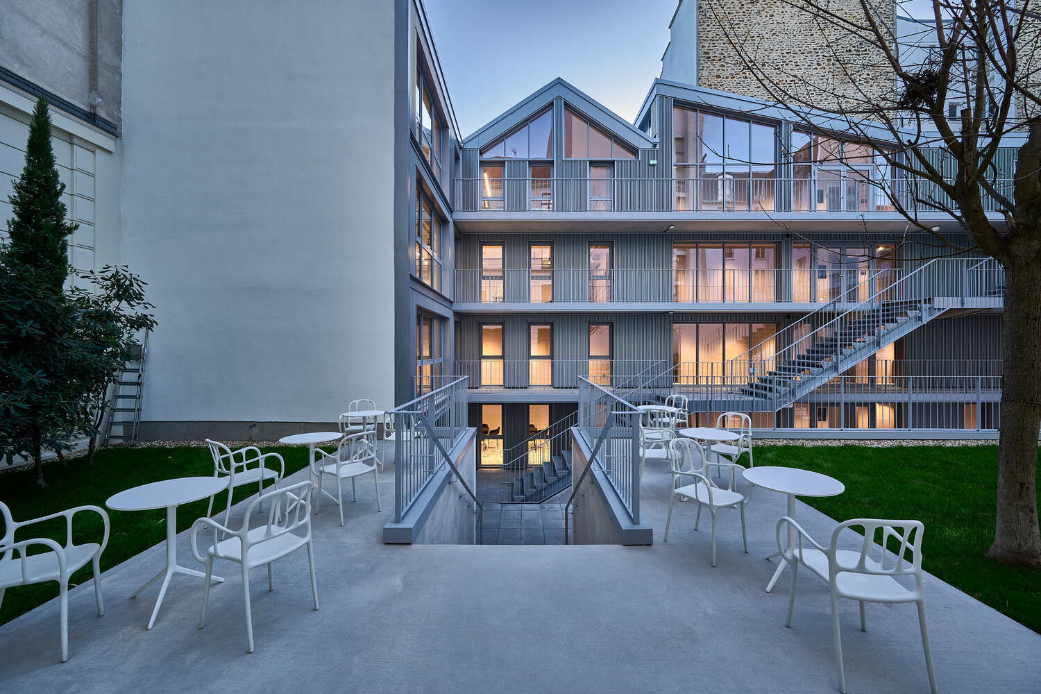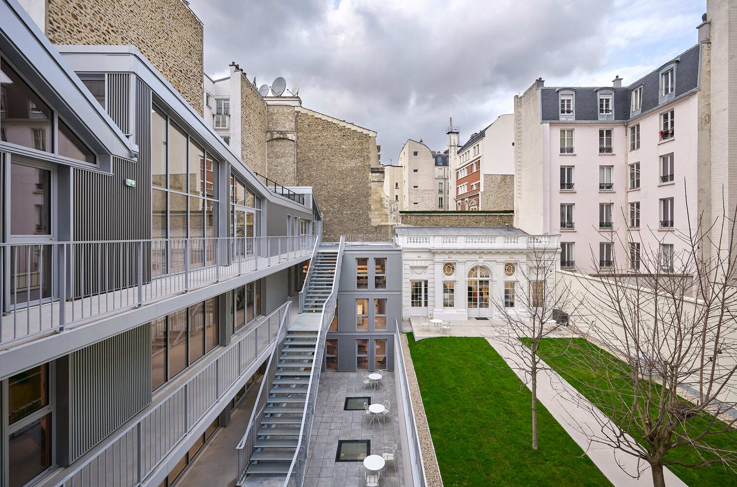 该项目位于巴黎十六区吕贝克街与博伊西埃尔街的交汇处,旨在打造马兰戈尼巴黎校区的新校区,占地约1500平方米,包含教室、礼堂、会议室、办公室等设施。通过改造和重新规划一座19世纪的古老建筑,该项目将其扩展为当代建筑和城市形态,并创造了一个促进历史建筑与现代建筑对话的新庭院。为了符合法律对开放空间和视线的要求,扩建部分被设计成围绕次级庭院的U形,次级庭院北侧由现有的共用墙围合。这片户外空间经过精心景观设计,增强了视觉联系,并将绿化融入城市肌理。