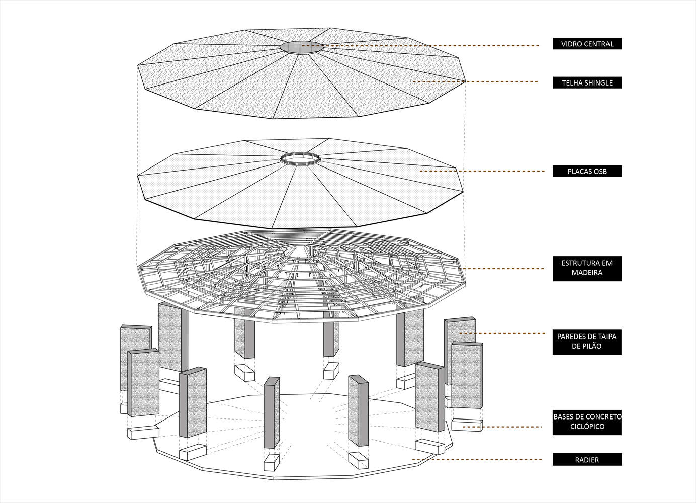 这个多功能活动室是孩子们梦寐以求的空间,可用于音乐、舞蹈、计算机和阅读课程。它呈十二面体形状,营造出一个自由开阔的内部空间。该多边形的每条径向线位置都设有一面夯土墙(即压实土壤制成的结构墙),用以支撑由易于操作的小截面构件组成的木桁架屋顶。十二根桁架汇聚于中央环状结构,环顶设有开口,进一步强化了这一空间的趣味性。