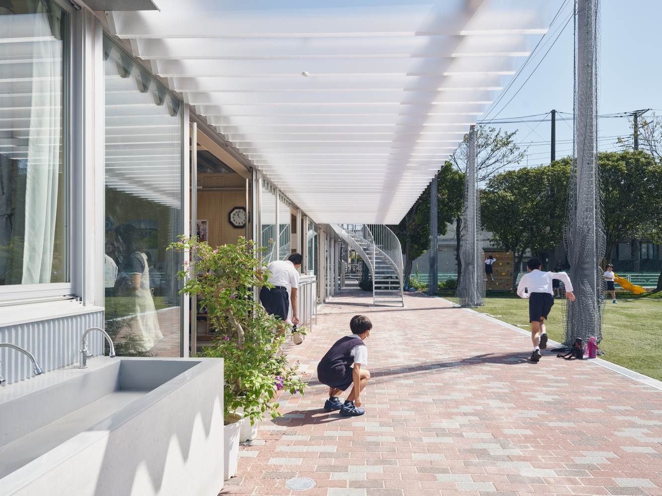 对于这所新朝鲜学校而言,向周边环境敞开怀抱是超越其在日本遭受歧视历史的核心主题。由于从街道上就能看到露台上的活动,这个三层阶梯露台便成了小镇的一个舞台。孩子们在露台上奔跑玩耍的景象,成了当地社区的日常一景。露台上的活动与周边环境相互交融,设计团队也有意让这所朝鲜学校成为当地风景的一部分。