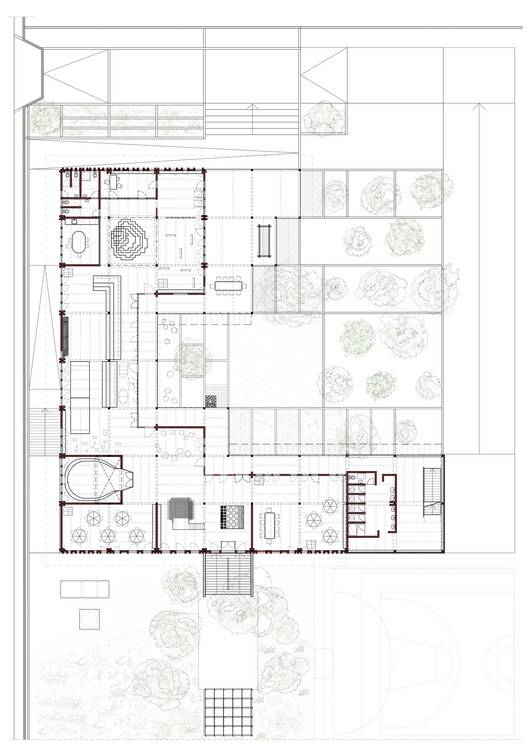 This kindergarten located in Cameroon draws inspiration from traditional African architectural philosophy and reimagines the possibilities of educational space. Its educational philosophy establishes an emotional connection between children and the space that shapes daily activities in a smooth and intuitive manner. Architects Vicente Guallart and Daniel Ib áñ ez adopted a low tech construction strategy, collaborating with local craftsmen and using local materials to respond to the development pressure brought by rapid urbanization with logs and rammed earth, creating a building that is closely connected to the land.
