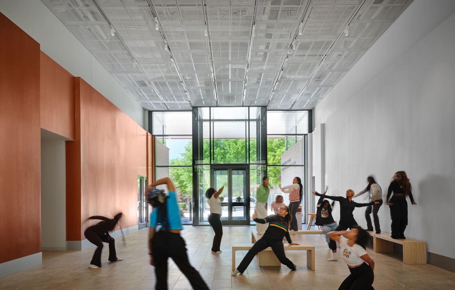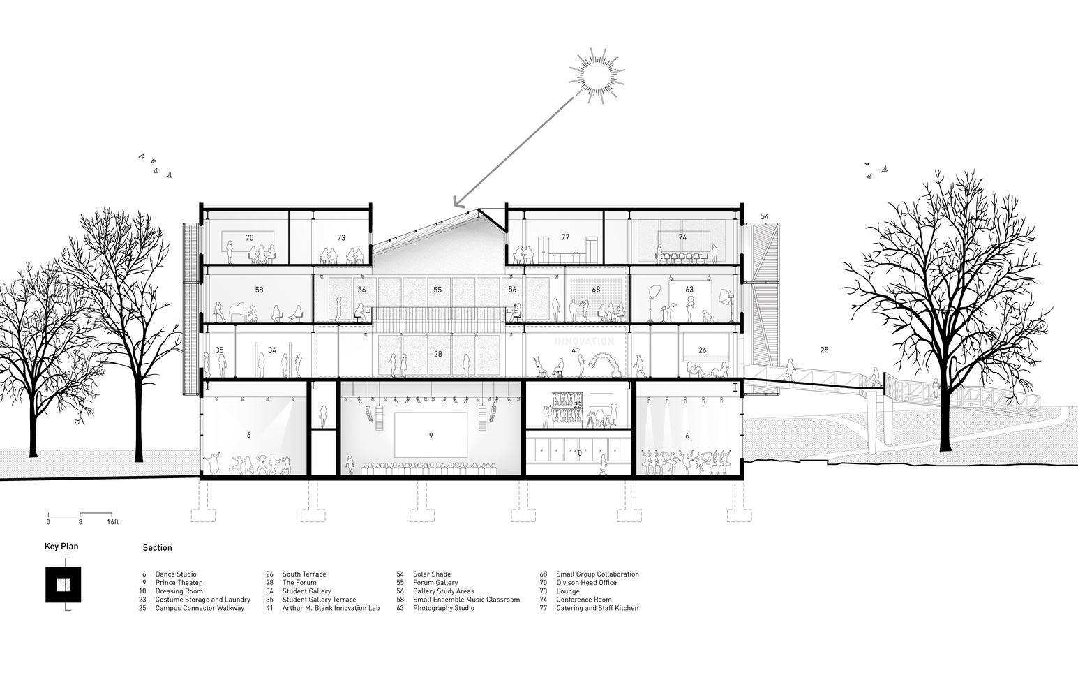 这座占地 82500 平方英尺的中心旨在通过在学习环境中构建以协作为核心的跨学科互动关系,进一步彰显斯佩尔曼学院在艺术与 STEM 领域的既有优势。底层设有室内外空间,包括提供露天学习、用餐和聚会场所的遮阳“门廊”,以及可举办演出、讲座、展览和各类活动的大厅,为公众与斯佩尔曼学院社区成员的交流互动创造了契机。教室与工作区则设于建筑上层,围绕两大协作中心布局。中心的核心区域是一个中央论坛,这是一个显眼且灵活多变的空间,学生可通过张贴展示、表演及其他各类活动与聚会,在此邂逅新朋友、接触新思想。论坛正上方设有一扇天窗,将自然光引入建筑深处。建筑西南角的显著位置设有亚瑟·M·布兰克创新实验室,这是一个跨学科创客空间,各专业学生汇聚于此,利用共享的先进工具开展协作项目。实验室大面积的玻璃幕墙可一览周边景观,而内部的高侧窗则让使用上层静谧工作区与教室的学生能够俯瞰实验室,通过观察学习。从建筑上层可通往一条高架步道,为学生、教职员工提供了直接且安全的校园通道。