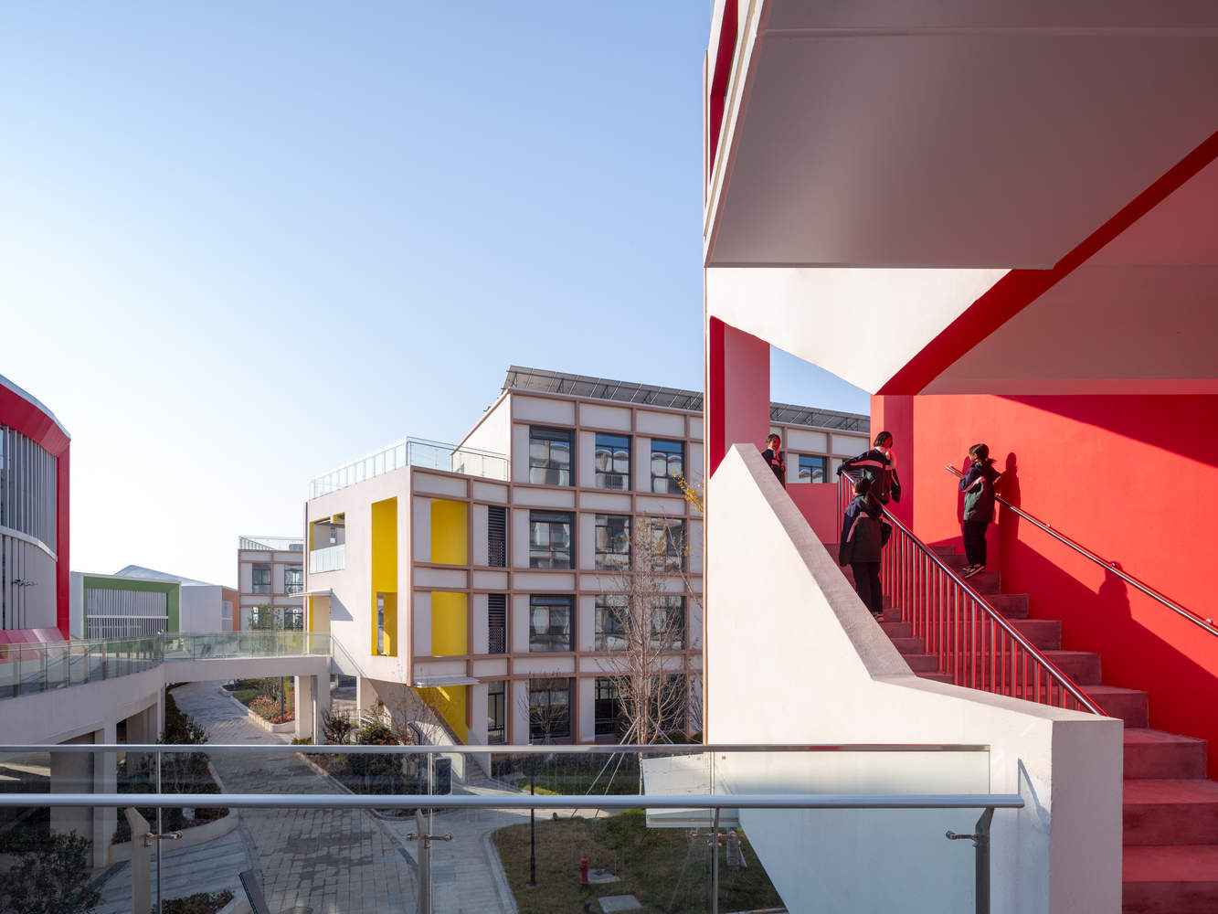 教学区由两座“E”形教学组团组成,建筑山墙面形成具有 “厚度” 的端头空间,在其中置入直跑楼梯、双跑楼梯,连接休息平台与缓冲空间,同时在顶层形成开放露台,在底层打造架空入口。“口袋公园”作为街道在教学空间中的延伸,以多样主题、形态和色彩的非正式学习空间散落在教学楼之间。