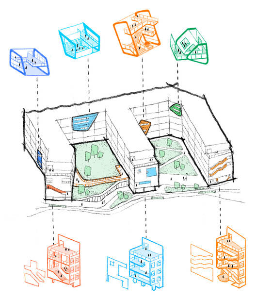 设计从传统教学空间中抽离创意性公共空间,以”成长之树“为概念,将教学空间、复合空间与创新空间分别比作树根、树干与树冠,并沿着西至东的方向布置,形成校园的整体规划体系。校园内通过街道与连廊串联分不同尺度的公共与半公共空间,如教室门口的口袋公园、走道尽头的山墙面,以及校园中心的大型文体活动聚落。