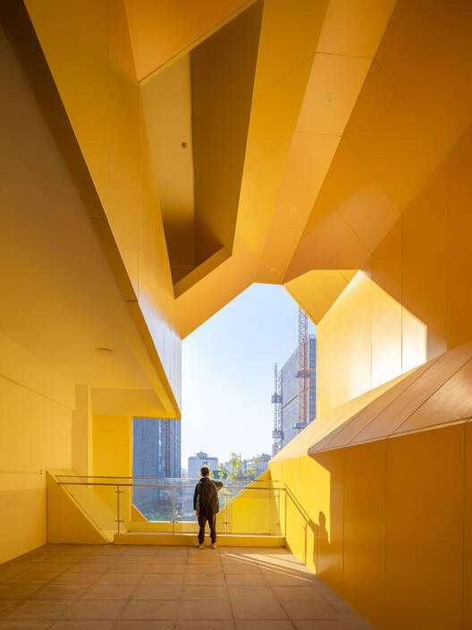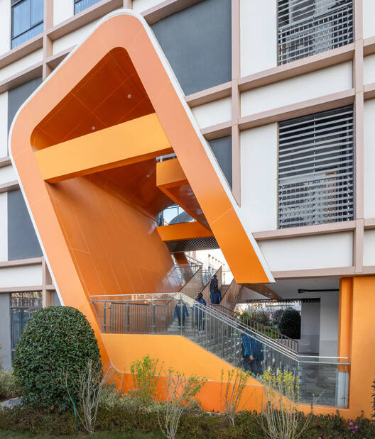 The teaching area consists of two "E" shaped teaching clusters. The building's gable wall forms a "thick" end space, in which straight and double running stairs are placed to connect the rest platform and buffer space. At the same time, an open terrace is formed on the top floor, and an elevated entrance is created on the bottom floor.. Pocket Park, as an extension of the street in the teaching space, is an informal learning space scattered among teaching buildings with diverse themes, forms, and colors.