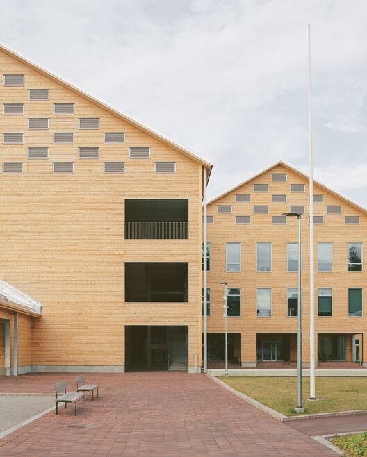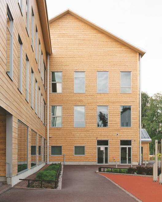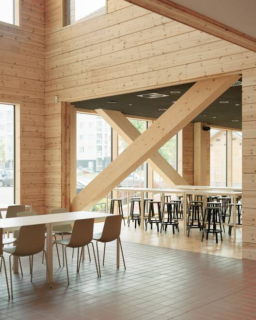 Monio is Finland's first three story timber framed public building and a new type of timber architecture that combines other timber construction methods with timber frames. This project can be seen as a bold experiment in the application of industrial logs on a large public building scale. Its architectural design is deeply rooted in the materials themselves, more specifically, in the use of logs. The building consists of six connected wooden houses that surround a tall internal street network, forming the main hall. The exterior walls and partition walls facing the interior of the wooden house are constructed using 275mm thick cross laminated non settling logs. There is no need to add additional insulation materials to the exterior walls, as the thick wooden structure not only forms the load-bearing structure but also serves as insulation, and is the inner and outer surface of the wall after completion. The project won the "Construction Site of the Year Award" in 2022 and the "Finnish Wood Award" in 2023.